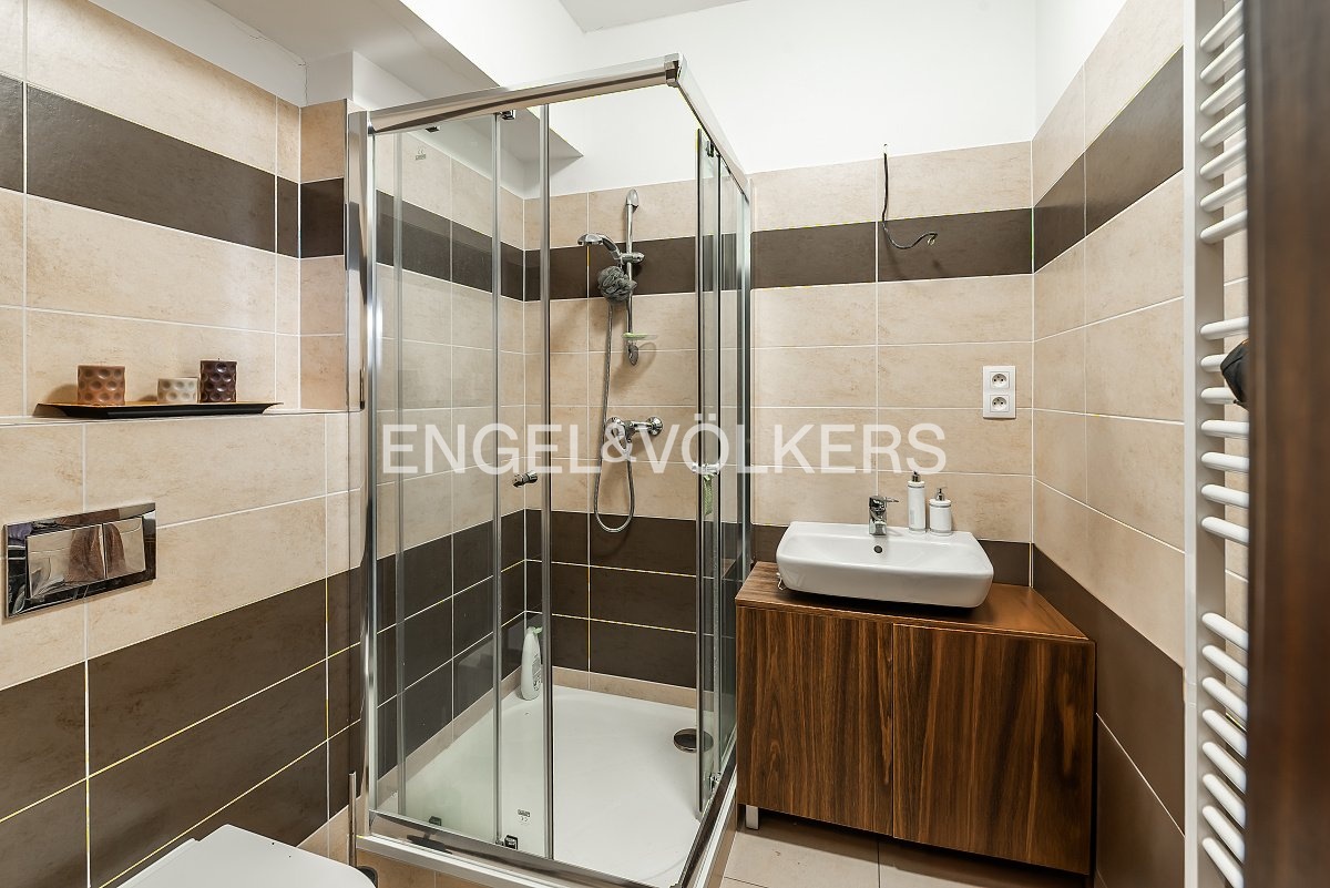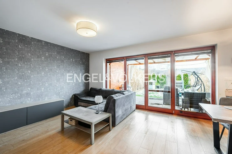 On the ground floor, there is an entrance hall, followed by a hallway with built-in storage space and a separate toilet. The dominant feature of the lower floor is a bright living room with a kitchenette fully equipped with all appliances and direct access to the garden, which provides pleasant privacy for relaxation and seating with family or friends.