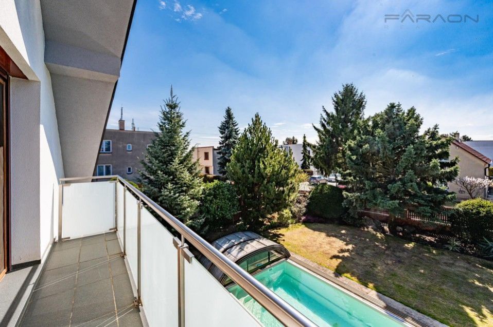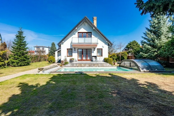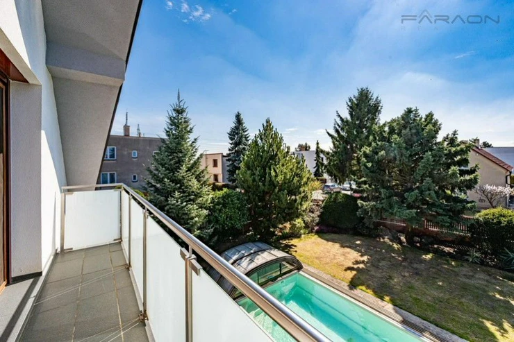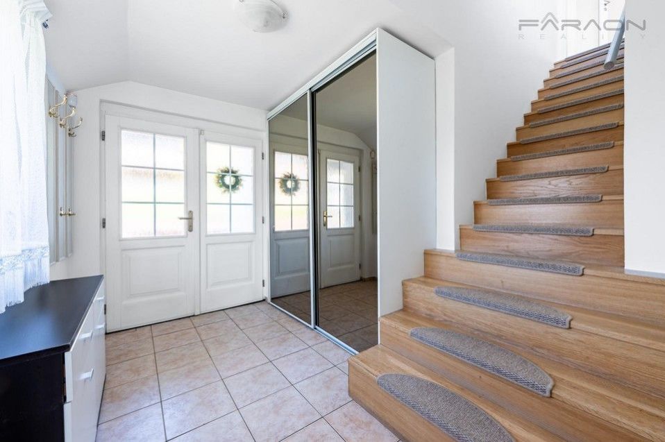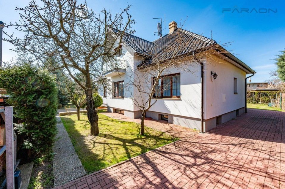 The interior with a total area of 350 m welcomes you with a bright living room with a fireplace and a dining area, which smoothly transitions to an outdoor terrace. It is here that an oasis of peace opens in the form of a well-kept garden of 800 m with its own swimming pool and mature fruit trees, making the house the perfect place for family relaxation and garden receptions. The ground floor also offers a fully equipped kitchen with all appliances, two bedrooms suitable for guests, a bathroom and technical facilities. The upper floor is designed as a souka roma zone with a second living room or games room with access to the balcony, two more bedrooms, a work area and a second bathroom. The practical basement then complements the extensive storage space, shower and spacious garage.