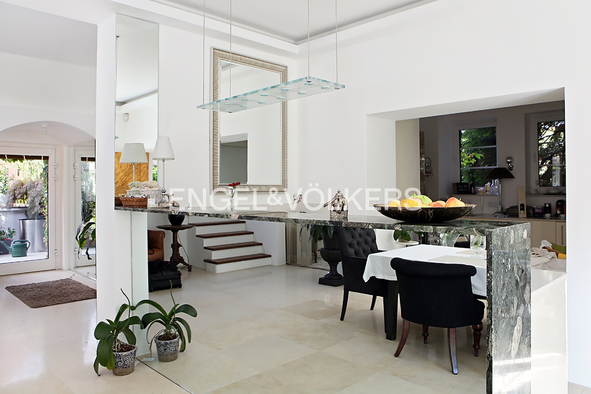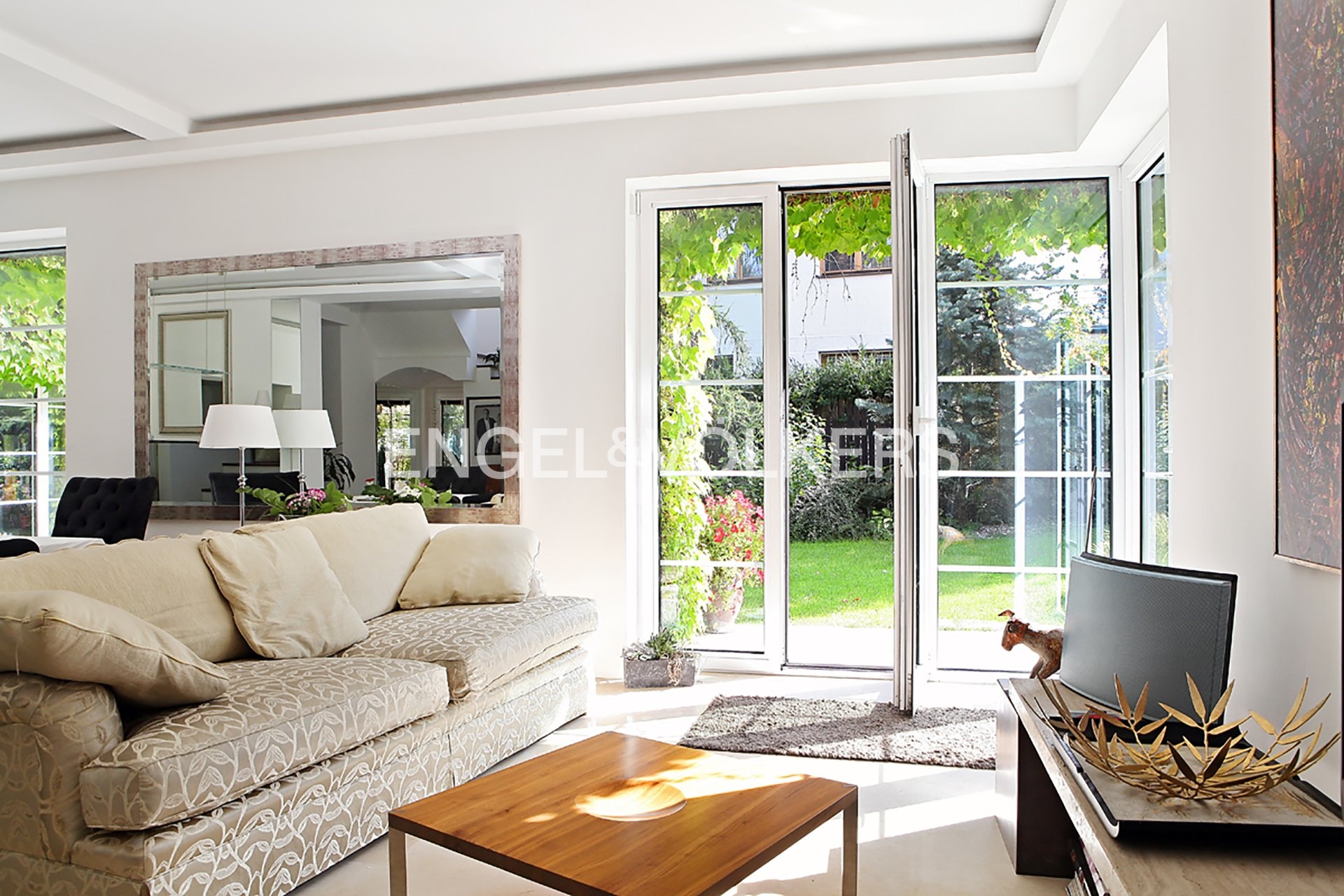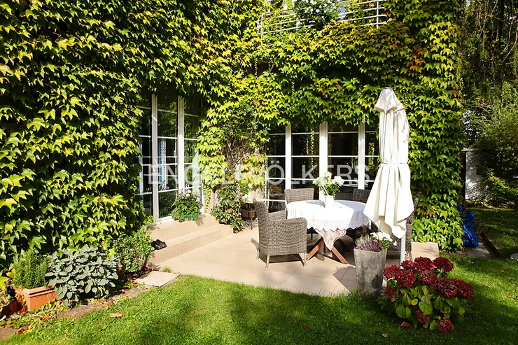 The house features three terraces with a total area of 48 sqm. The ground floor consists of an entrance hall, a bright living room with a dining area and access to a terrace, a kitchen, a study, and a bathroom. Upstairs, there are two bedrooms (one of which has a balcony), another terrace, a bathroom, a walk-in closet, and a separate toilet. In the attic, there is an additional room with access to a terrace. The property also includes a heated garden house and a cellar. The house is equipped with a kitchen unit with appliances, built-in wardrobes, a washing machine, and a dryer. High-speed internet, wooden floors, and tiles are available.