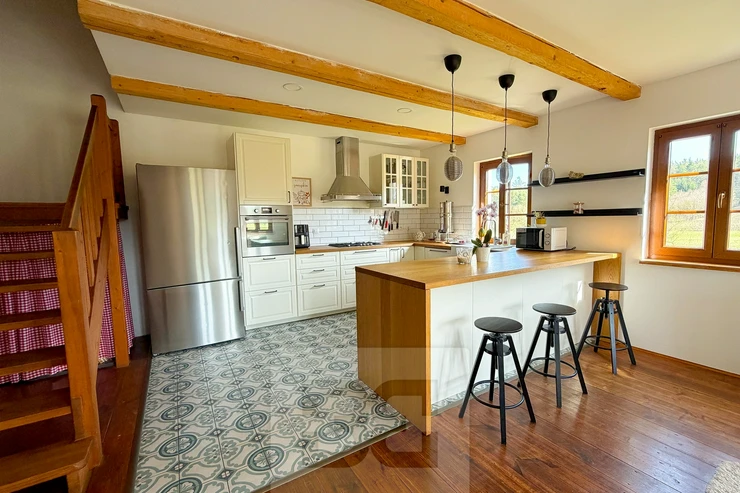 Interiér byl navržen s důrazem na komfort, kvalitu a harmonii s okolní přírodou. Najdete zde moderní spotřebiče, pečlivě vybrané materiály a vkusné provedení, které vytváří pocit tepla, klidu a opravdového domova.