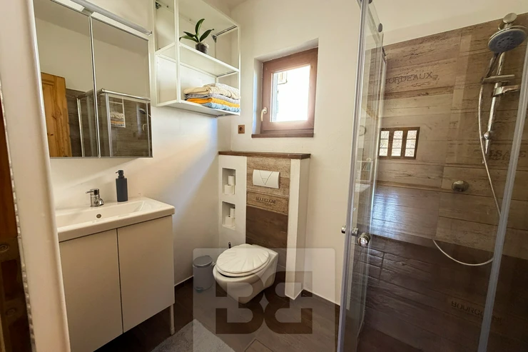 Prostor, který dává svobodu a dvě podlaží plná světla, vzduchu a výhledů do zeleně. V přízemí najdete hlavní místnost spojenou s kuchyní, vkusně oddlenou barovým pultem. Další je menší pokoj s manželskou postelí, těsně sousedící s koupelnou se sprchovým koutem a toaletou. Poslední místnost je místnost techniká, kde najdete pračku, sušičku a dostatek úložného prosotoru.