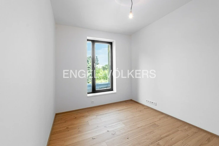 The heart of the house is a custom-designed kitchen that flows seamlessly into the living room and offers direct access to the garden through French doors. The garden is surrounded by mature trees that provide natural shade and a pleasant climate even in summer. There is also a stylish bathroom and study on this floor. On the second floor is the master bedroom with French windows and a pleasant view of the beautiful greenery. The master bedroom is complemented by a second bathroom with a shower and two further bedrooms.
