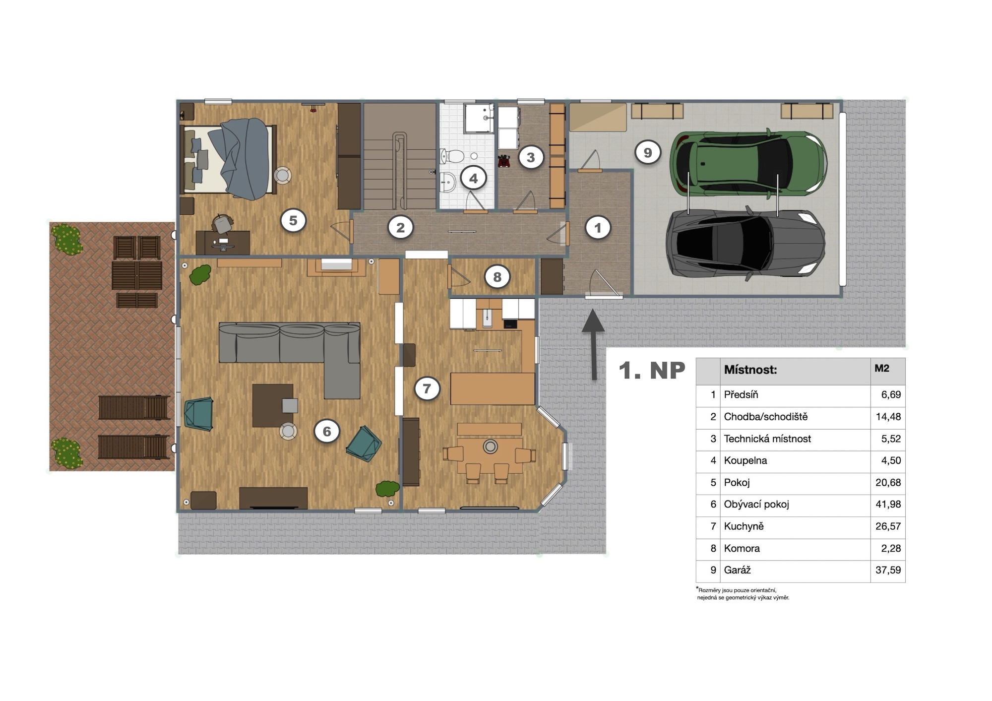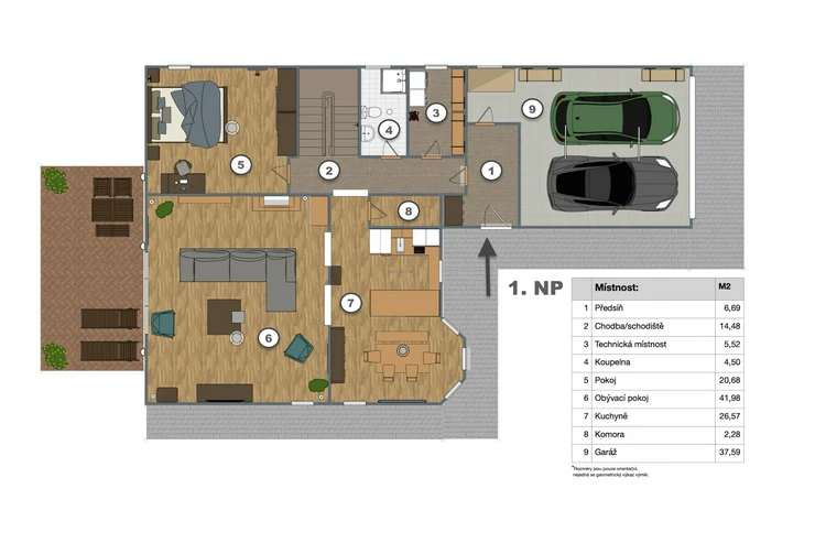 An additional attic space (38 sqm) provides practical storage. The house also features a double garage (37.5 sqm) with space for a workshop.