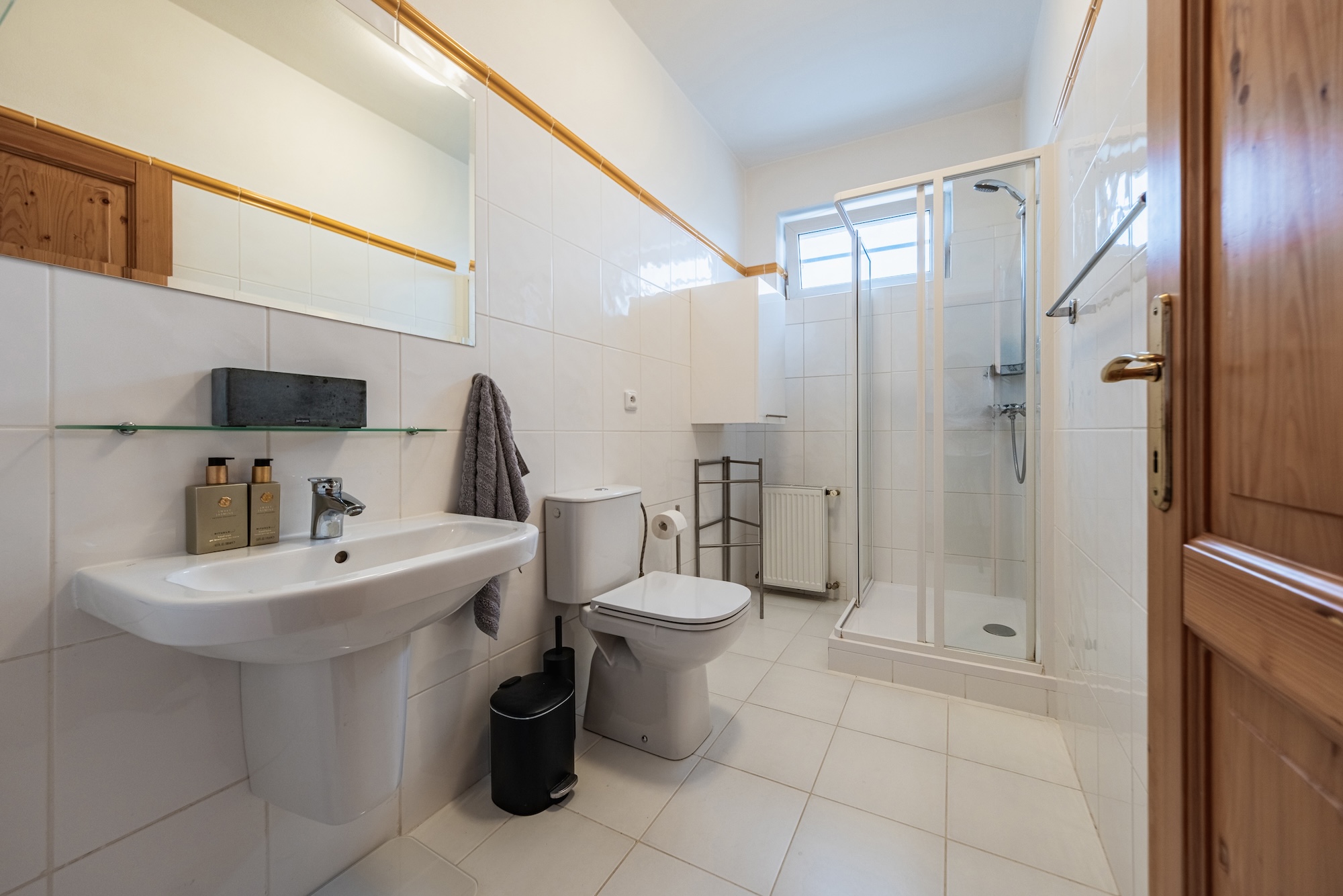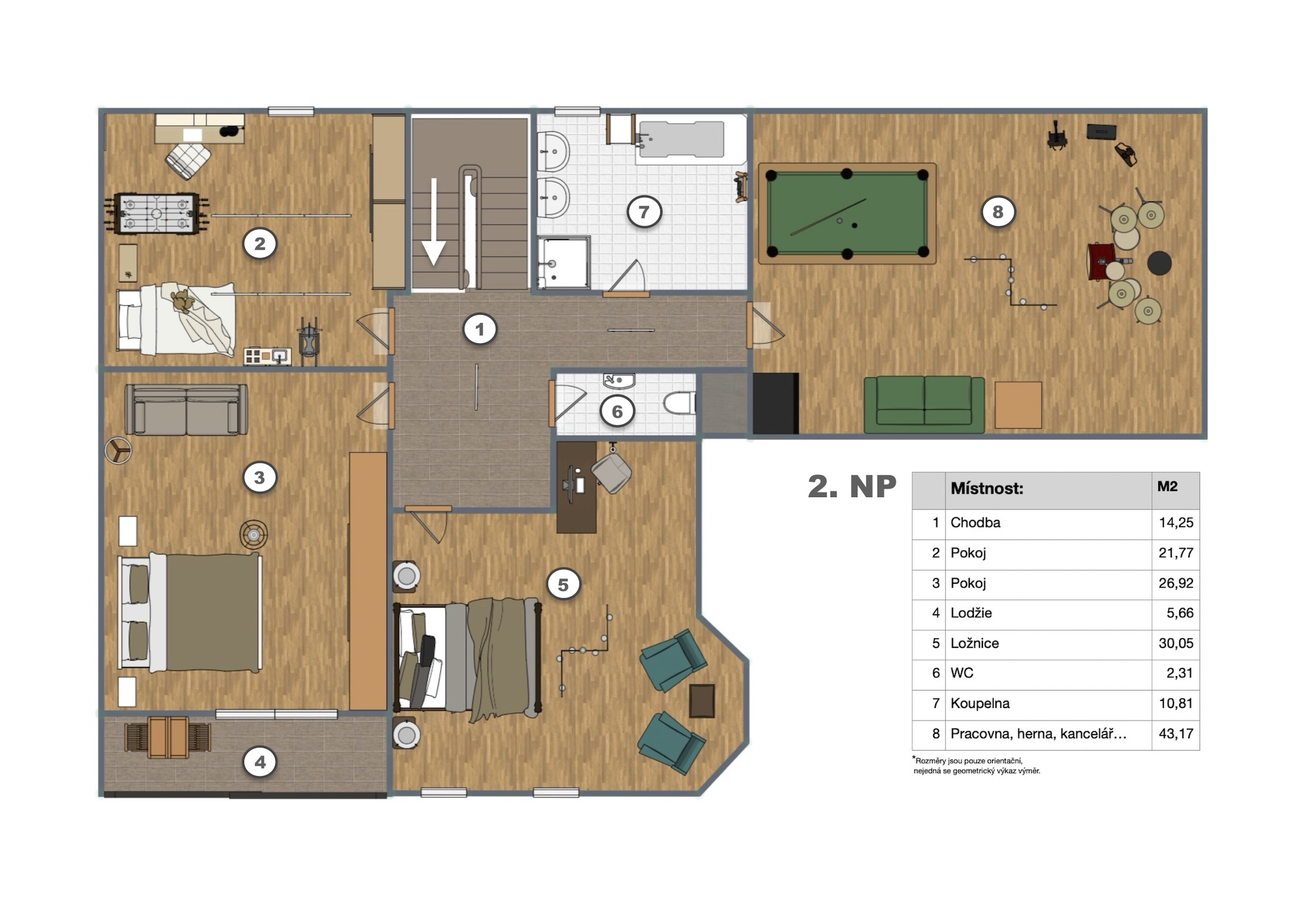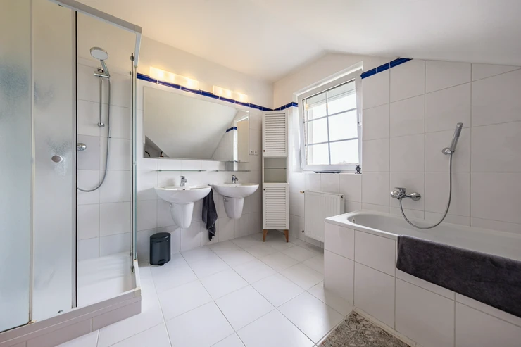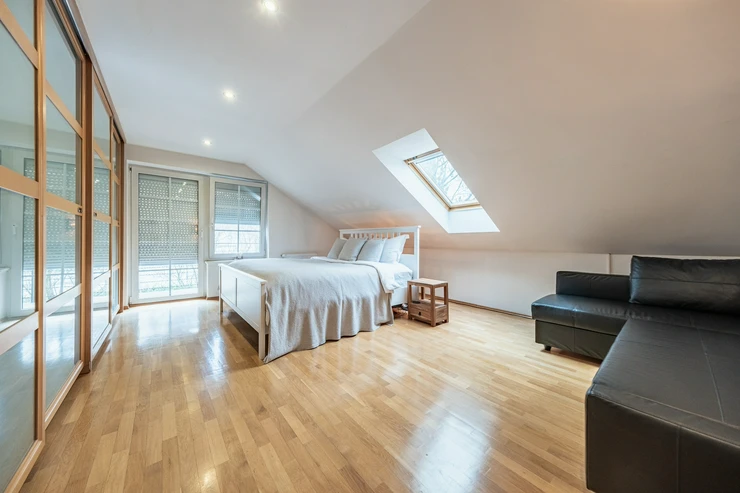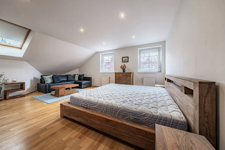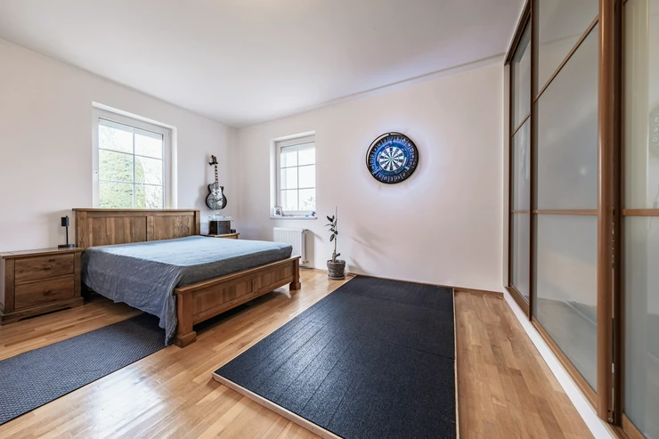 Upstairs, there are three spacious bedrooms – two are ideal for children's rooms or home offices (22 and 30 sqm), and a master bedroom (27 sqm) with a balcony and built-in wardrobes. A large attic room (43 sqm), suitable as a playroom, home office, or additional bedroom is located there as well. The upper floor includes a main bathroom with both a bathtub and a shower, as well as a separate toilet.