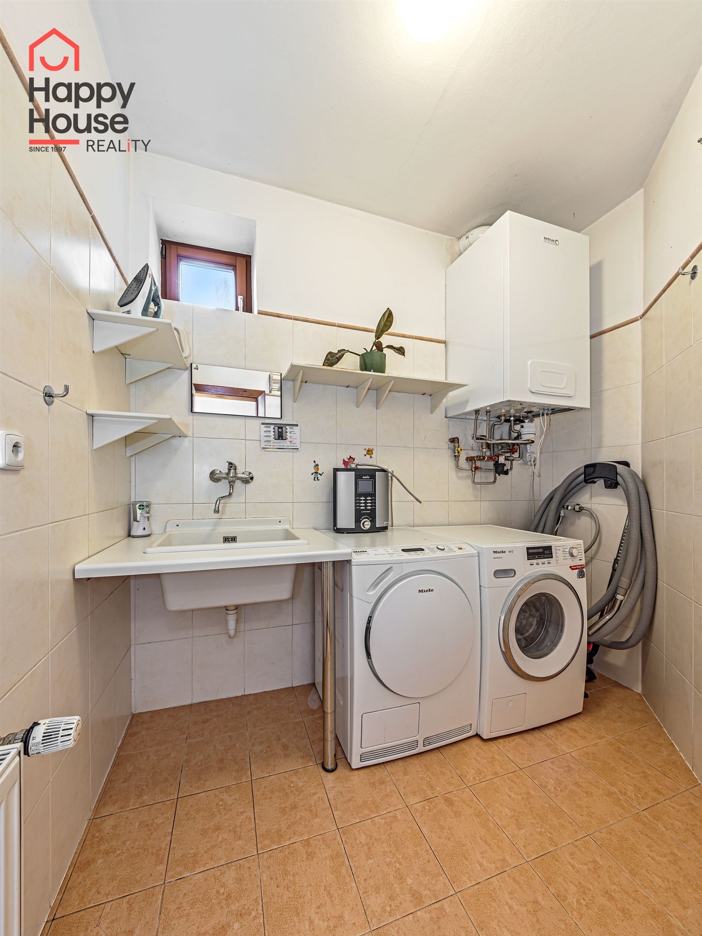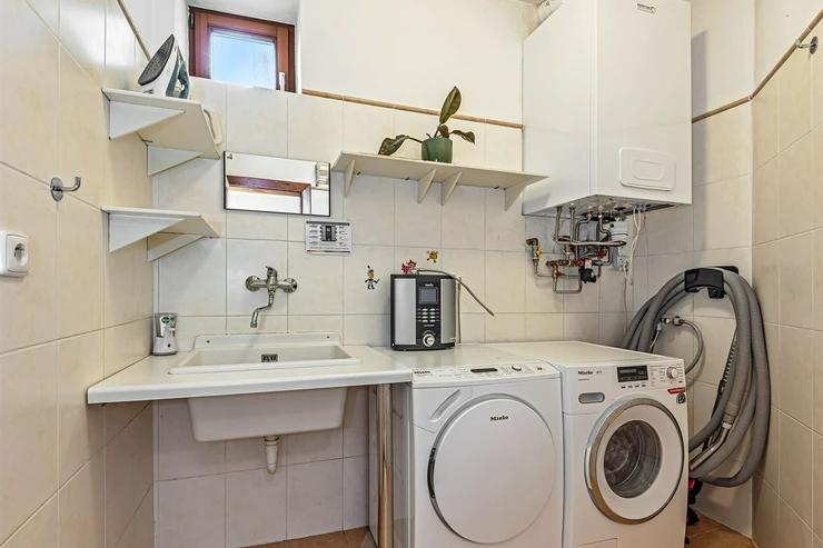 The bathrooms feature a bathtub, shower, toilet, and heated floor. In the utility room, there is a gas boiler, and a washer with dryer. Parking for one car in the garage and three additional vehicles on private property in front of the garage. Wooden floors and tiles, electrically controlled blinds, central vacuum, alarm system. The garden has automatic irrigation and a robotic mower.