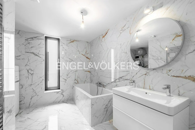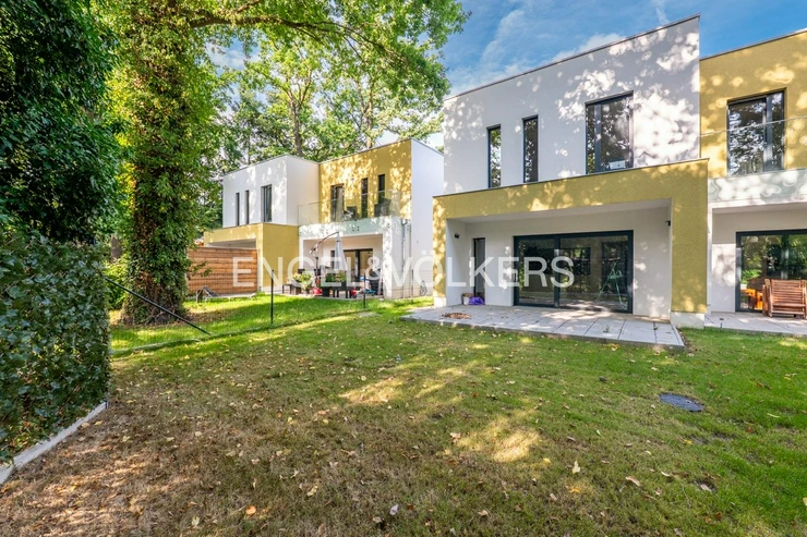 The heart of the house is a custom-designed kitchen that flows seamlessly into the living room and offers direct access to the garden through French doors. The garden is surrounded by mature trees that provide natural shade and a pleasant climate even in summer. There is also a stylish bathroom and study on this floor. On the second floor is the master bedroom with French windows and a pleasant view of the beautiful greenery. The master bedroom is complemented by a second bathroom with a shower and two further bedrooms.