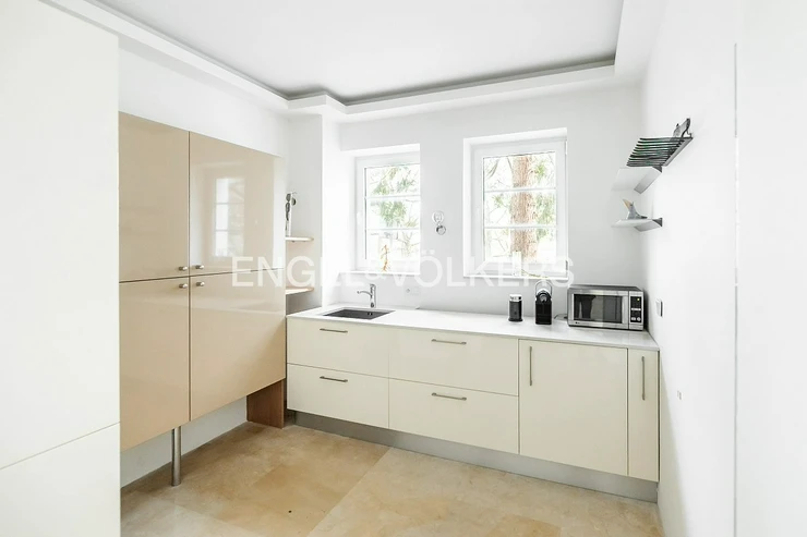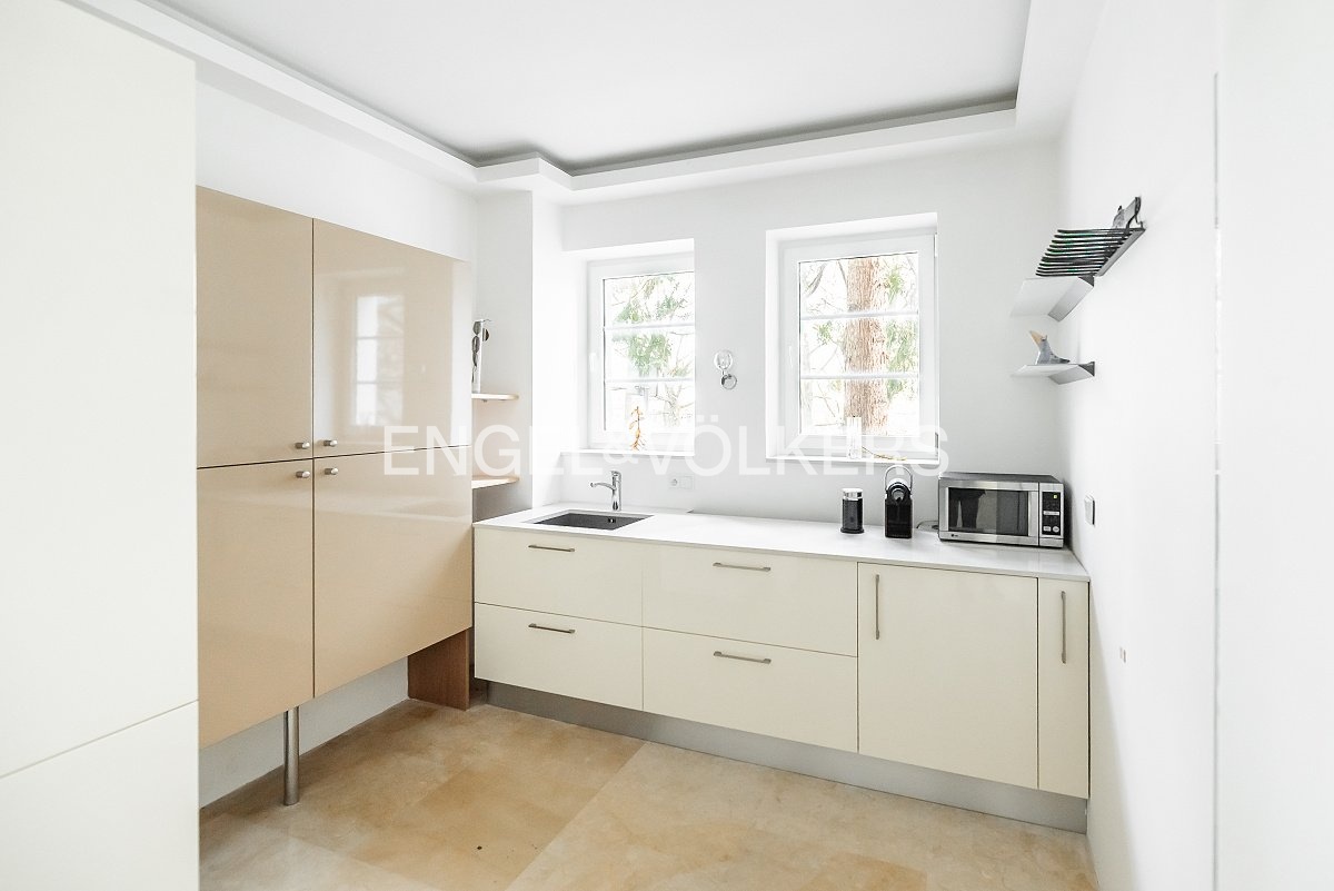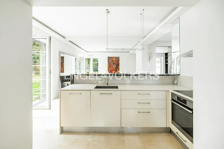 The house features three terraces with a total area of 48 sqm. The ground floor consists of an entrance hall, a bright living room with a dining area and access to a terrace, a kitchen, a study, and a bathroom. Upstairs, there are two bedrooms (one of which has a balcony), another terrace, a bathroom, a walk-in closet, and a separate toilet. In the attic, there is an additional room with access to a terrace. The property also includes a heated garden house and a cellar. The house is equipped with a kitchen unit with appliances, built-in wardrobes, a washing machine, and a dryer. High-speed internet, wooden floors, and tiles are available.
