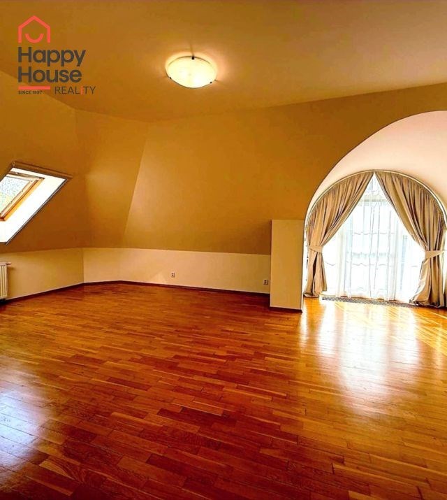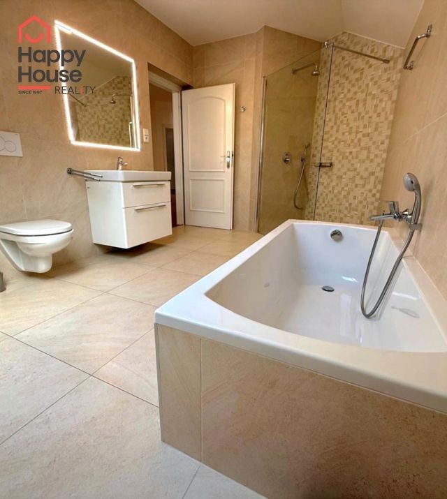 We are offering for rent a detached six-bedroom family house with a size of 400 sqm including a garden of 775 sqm, three balconies (each 3.5 sqm), and a double garage of 36 sqm located in the popular part of Průhonice village. The house is situated in a pleasant environment of newly built family homes close to the village center and the eastern entrance to Průhonice Park. It is a modern building particularly suitable for families with children. The main advantage of this location is the proximity to the city center and high-quality living.