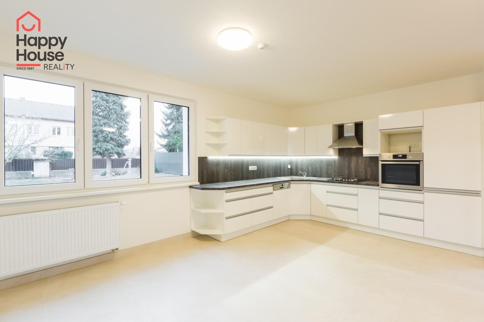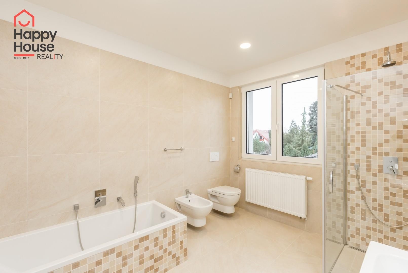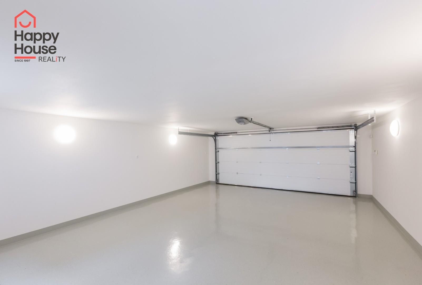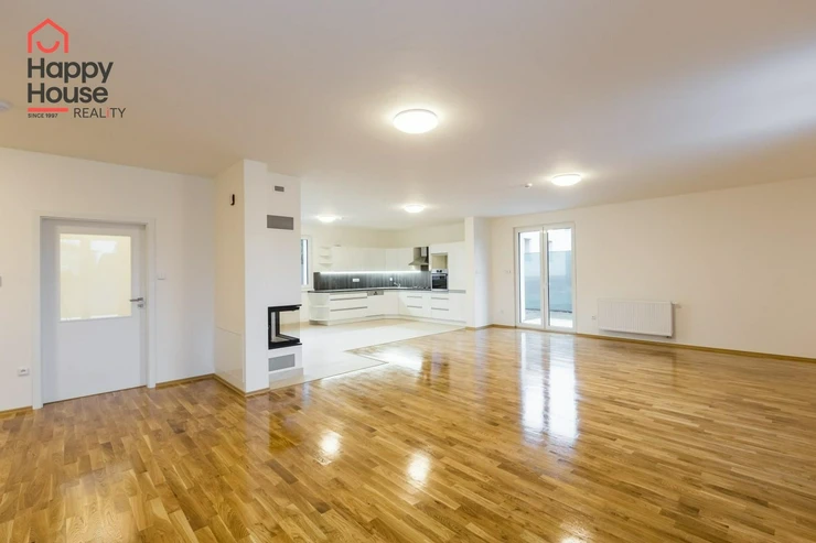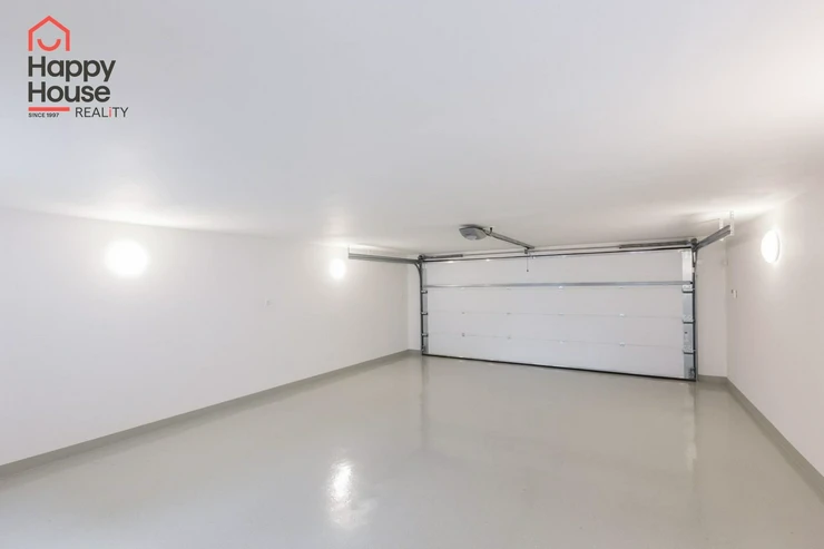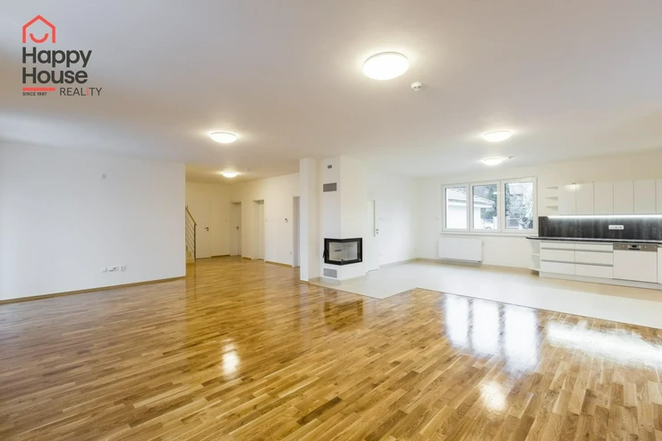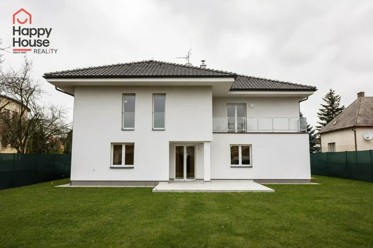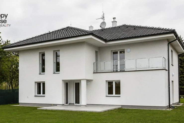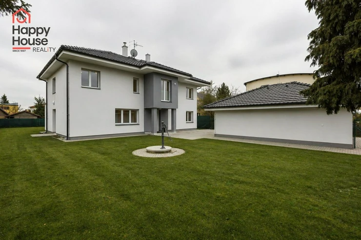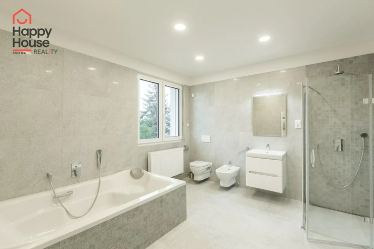 Beautiful modern family house with a terrace, garden, and a double garage located in a quiet area of Prague 4, Újezd u Průhonic. The house, with a total area of 315 sqm, is offered unfurnished. On the ground floor, there is an entrance hall (7 sqm) with a built-in wardrobe, a 16 sqm hall, a fully equipped kitchen with a dining area (21 sqm), a living room (51 sqm) with a fireplace and entrance to the terrace (25 sqm), a guest room (24 sqm), a laundry room (5 sqm), a bathroom (11 sqm with a sink, bathroom cabinets, a bathtub, a shower, a toilet, a bidet) and a separate toilet (6 sqm - toilet, bidet, sink, boiler). The first floor includes 4 bedrooms (26 sqm + 27 sqm + 22 sqm + 18 sqm), a corridor (15 sqm), 2 bathrooms (13 sqm + 10 sqm - sink, bathroom cabinets, mirror, bathtub, shower, toilet, bidet) and a terrace (10 sqm). The house is equipped with lighting throughout the house, telephone line, TV/SAT wiring, and an alarm system that can be connected to a central monitoring station. The rooms have wooden parquets or laminate flooring, while other areas are tiled. In the garden, there is a separate double garage (55 sqm) and an automatic irrigation system using well water.
