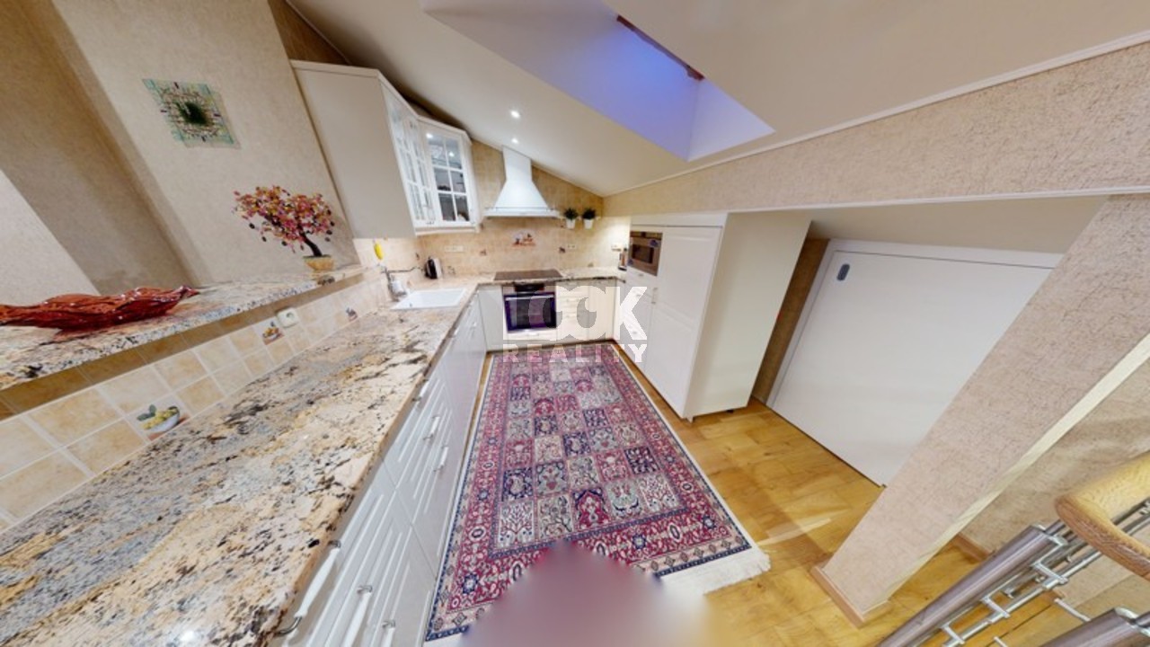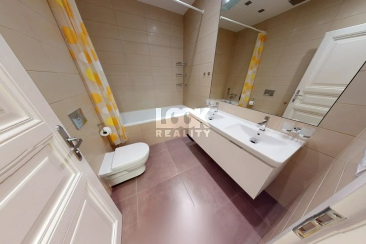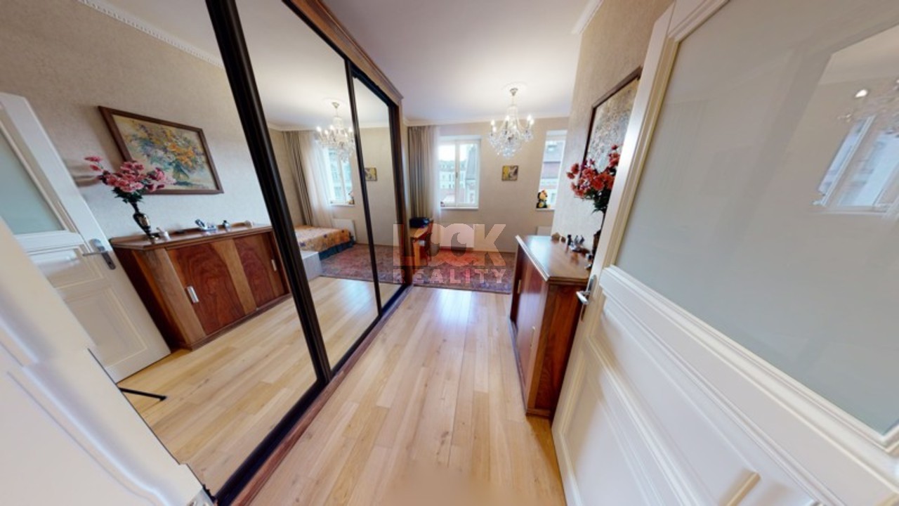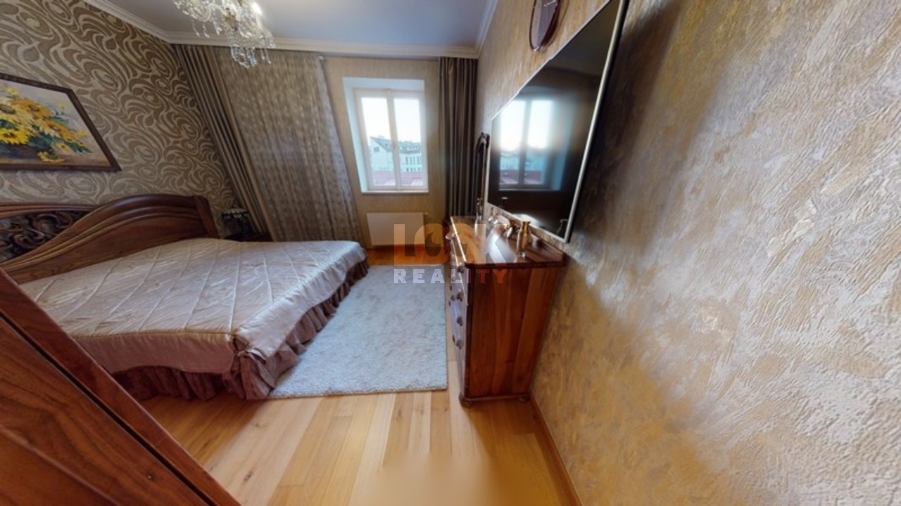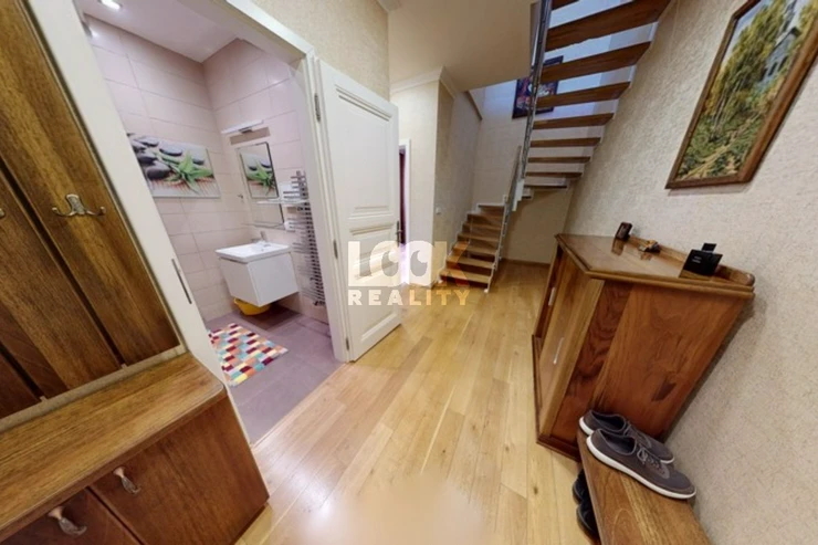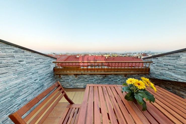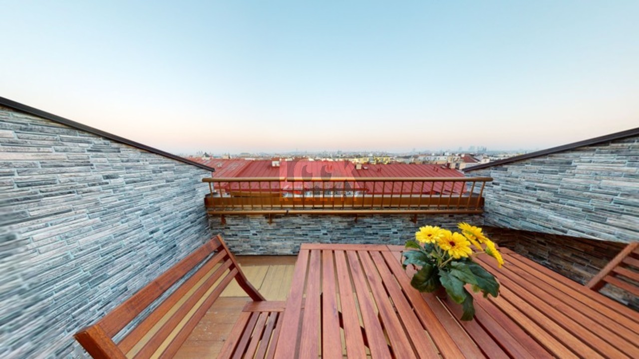 Luxury duplex apartment with a terrace overlooking Prague. We offer for sale a luxury duplex apartment 3 + kk with a total area of 119.8 m2 with a terrace (7.48 m2), located on the 5th and 6th floors of a building with an elevator in Drtinova Street. The apartment is fully furnished with luxury furniture made of natural walnut wood (including built-in wardrobes). On the first floor there is a hallway, two separate bedrooms, a bathroom and a toilet. On the second floor there is a kitchen with pantry, living room with dining area and terrace. The kitchen with African stone worktop is equipped with all appliances. In the bathroom there is a bath and toilet. Another toilet is together with a washing machine separately. The living room is oriented to the east, the bedroom to the west. Other equipment: smart home control for heating, air conditioning in the living room, natural oak parquet floors, security entrance door. There is a gas boiler room for the whole house. The apartment has a cellar in the basement. From the terrace there is a beautiful view of the whole of Prague, the Museum and other sights of Prague. A garage can be rented in the neighboring building. The house is located in an area with excellent transport links - a few minutes from the house is a tram stop Svandovo divadlo - two minutes metro B - Andel. In the vicinity of all civic amenities. Within walking distance is the shopping center Andel, Kinsky garden, Petrinske sady park, lookout tower Petrin, Vltava embankment. Luxury living and great investment, we recommend.