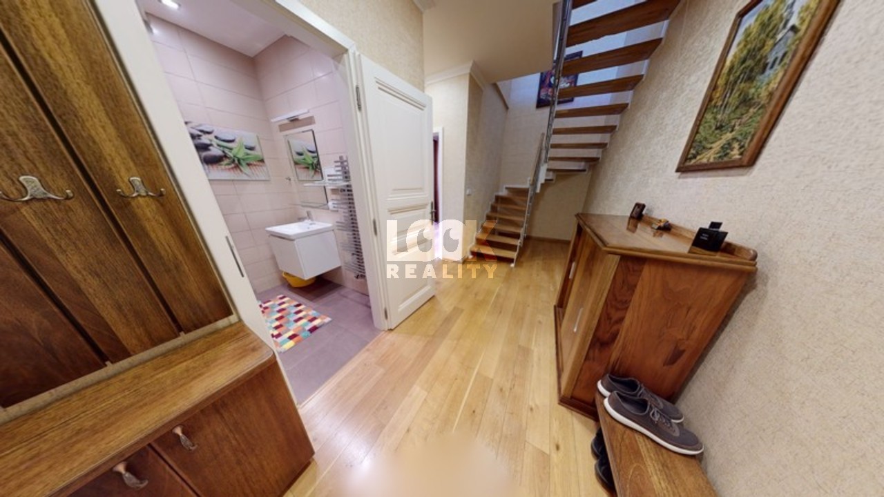 Luxury duplex apartment with a terrace overlooking Prague. We offer for sale a luxury duplex apartment 3 + kk with a total area of ​​119.8 m2 with a terrace (7.48 m2), located on the 5th and 6th floors of a building with an elevator in Drtinova Street. The apartment is fully furnished with luxury furniture made of natural walnut wood (including built-in wardrobes). On the first floor there is a hallway, two separate bedrooms, a bathroom and a toilet. On the second floor there is a kitchen with pantry, living room with dining area and terrace. The kitchen with African stone worktop is equipped with all appliances. In the bathroom there is a bath and toilet. Another toilet is together with a washing machine separately. The living room is oriented to the east, the bedroom to the west. Other equipment: smart home control for heating, air conditioning in the living room, natural oak parquet floors, security entrance door. There is a gas boiler room for the whole house. The apartment has a cellar in the basement. From the terrace there is a beautiful view of the whole of Prague, the Museum and other sights of Prague. A garage can be rented in the neighboring building. The house is located in an area with excellent transport links - a few minutes from the house is a tram stop Svandovo divadlo - two minutes metro B - Andel. In the vicinity of all civic amenities. Within walking distance is the shopping center Andel, Kinsky garden, Petrinske sady park, lookout tower Petrin, Vltava embankment. Luxury living and great investment, we recommend.