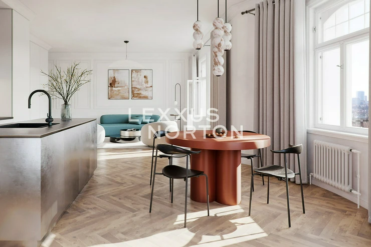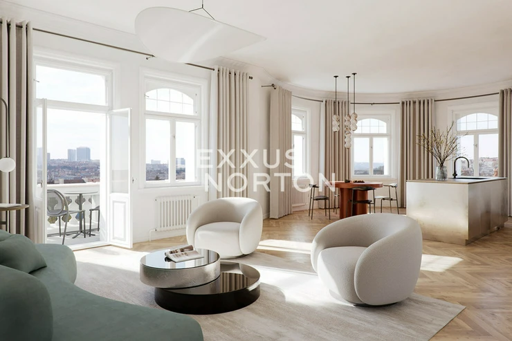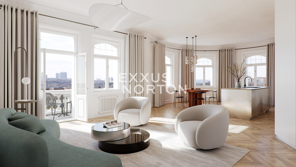 We present an exceptional 3-bedroom apartment of 139 sqm with a generous 25 sqm terrace. The entrance hall is located on the 6th floor, from where a staircase leads up to the main living space on the 7th floor. The layout features a spacious living room with a kitchenette and direct access to the terrace, a master bedroom with its own bathroom, walk-in closet and another terrace entrance, a second bedroom with an en-suite bathroom, and a unique study situated in the building’s corner tower.The tower space makes this apartment truly one-of-a-kind, adding an unmistakable character and a sense of genius loci. High ceilings, large rooms and breathtaking views of Prague’s southern skyline and the greenery of Heroldovy Sady park create an exceptional living atmosphere.The Art Nouveau corner building has undergone a complete and sensitive renovation, preserving original architectural details in the common areas. A new elevator ensures convenient access. The project is completed and the apartment is ready for immediate occupancy.A parking space must be purchased for this apartment for CZK 850.000 + VAT.Oak parquet floors, wooden double windows, bathroom fitted with quality sanitary ware, gas boiler room in the basementResidence Norska is located in a historic Art Nouveau corner building at the intersection of Kodanska and Norska streets, directly opposite Heroldovy Sady park. The location combines the elegance of old Vrsovice with the energy of modern city life – stylish cafés, restaurants, cultural venues and full civic amenities of Prague’s wider city center are all within easy reach. Thanks to excellent transport connections, the city center can be reached in just a few minutes.