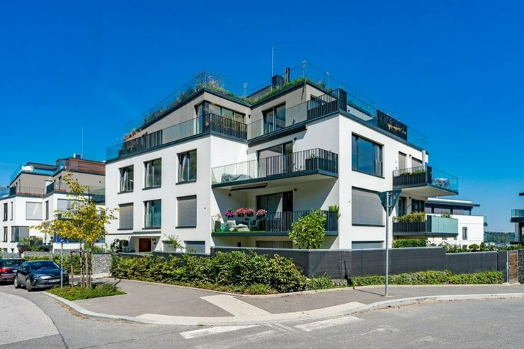 Low-energy, highly superior apartment 4+kk, with a total area of 153.2 m2, with two terraces, located on the 2nd floor of the premium new building "top' residence Pomezí", built in 2020, right next to the Cibulka and Vidoule forest park, yet within easy reach of the center of city. The location on top of the hill offers unique views of the Prague panorama.