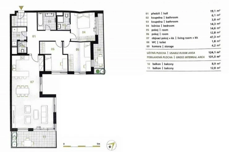 Floor area 131.5 m2, terrace 12.8 m2, terrace 8.9 m2, cellar 9 m2, two garage parking spaces.