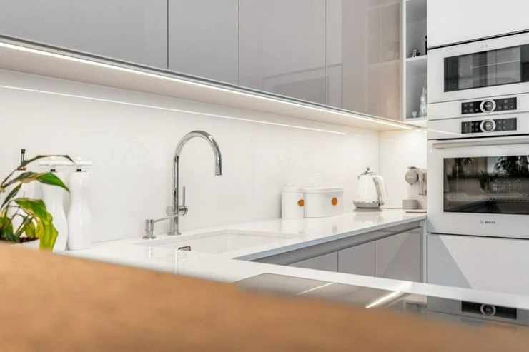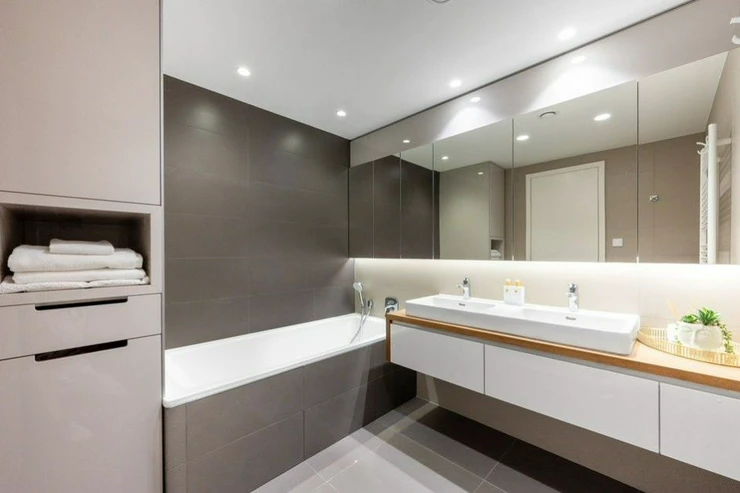 It is worth noting the design lighting in all rooms and the custom-made furniture in oak - lacquer in a powder shade, made according to the design of the interior designer. There is a large amount of cleverly designed storage space in the apartment, with lighting inside and outside. The kitchen is equipped with top-class BOSCH appliances, the induction hob has an integrated extractor hood. Refreshing comfort is offered by an American-style refrigerator with an icebox or a built-in wine cabinet. The worktop of the kitchen unit is made of Corian artificial stone.