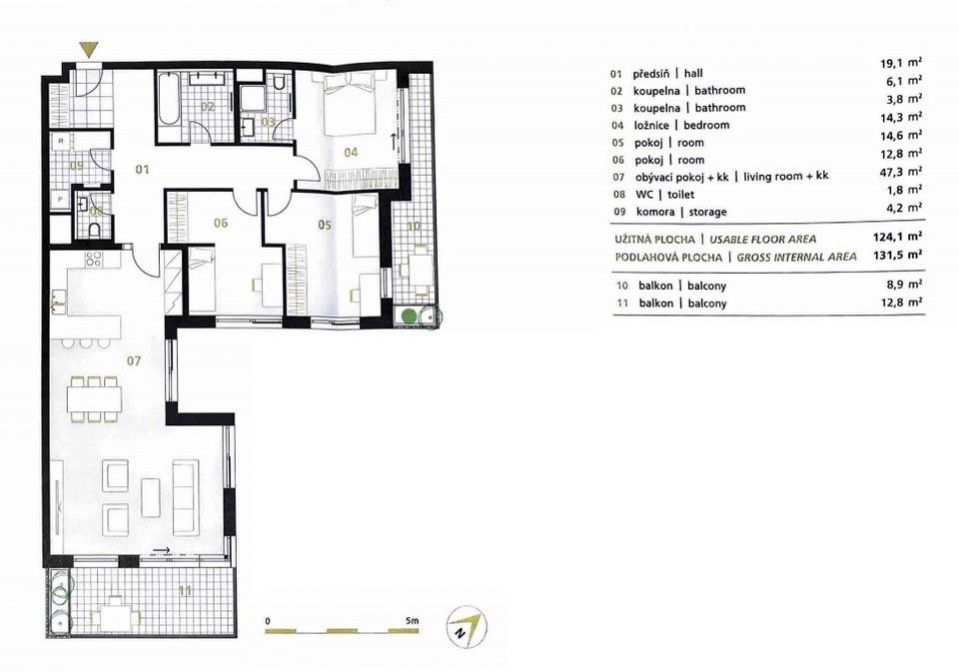 The layout of the apartment (131.5 m2) consists of an entrance hall, 3 bedrooms, a living room with a dining area and a kitchenette, a bathroom with a bathtub, an en-suite bathroom with a shower and a toilet belonging to the bedroom, another separate toilet and a utility room. The apartment has 2 terraces - with an entrance from the living room (12.8 m2) and an entrance from the bedroom (8.9 m2). The price also includes a spacious cellar and 2 parking spaces in the basement of the house.