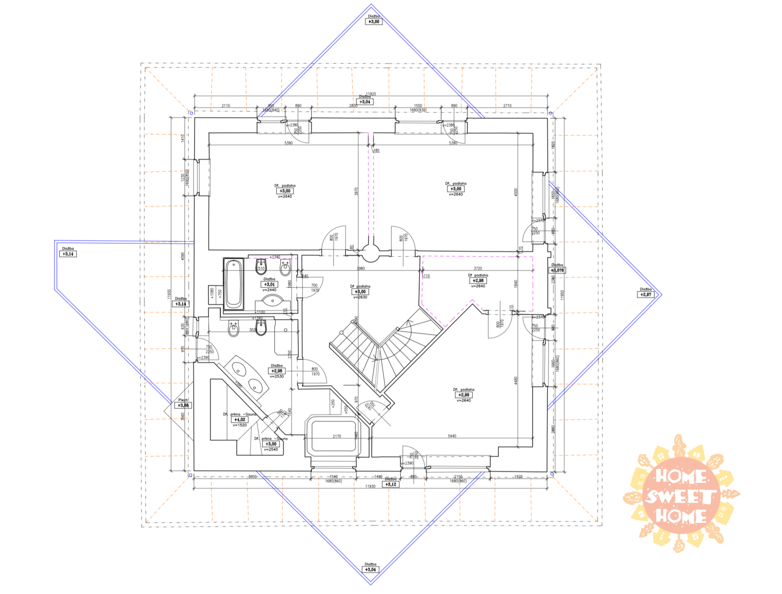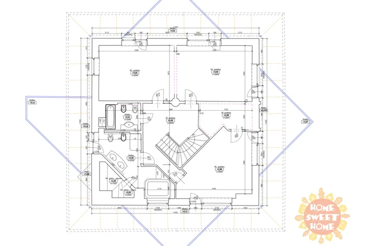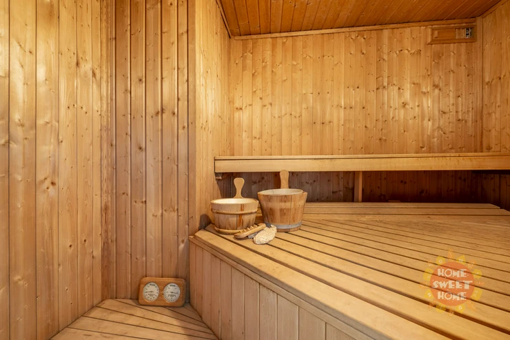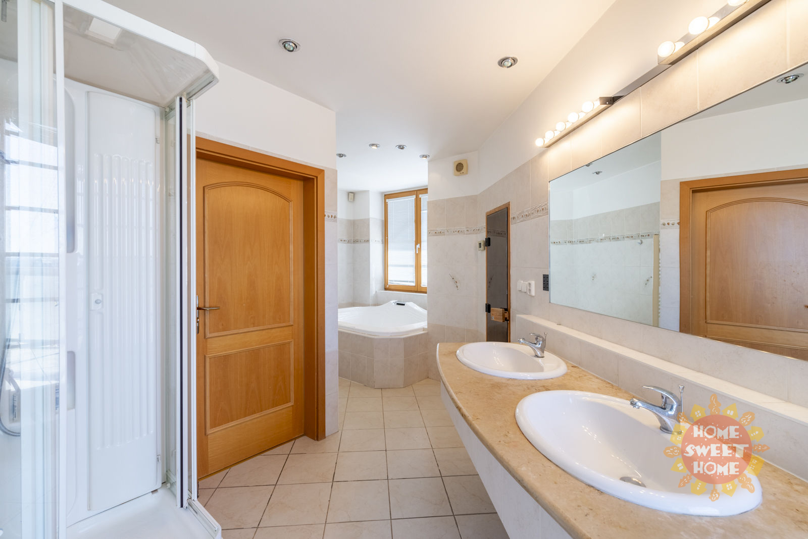 On the ground floor there is a hallway, kitchen with dining area, living room, bathroom, toilet. Up the stairs we get to the first floor, where we find three separate rooms, bathroom, toilet and sauna. On the second floor an open space for your own use. From each room there is access to the sunny terrace.