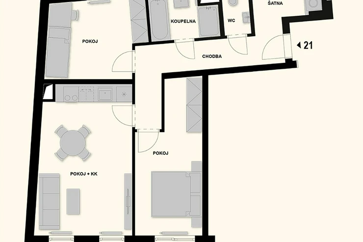 The modern residential unit No. 21 with the layout of 3 rooms + kitchenette has a floor area of 71.2 m². It is situated on the 2nd floor.