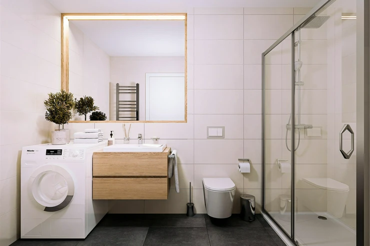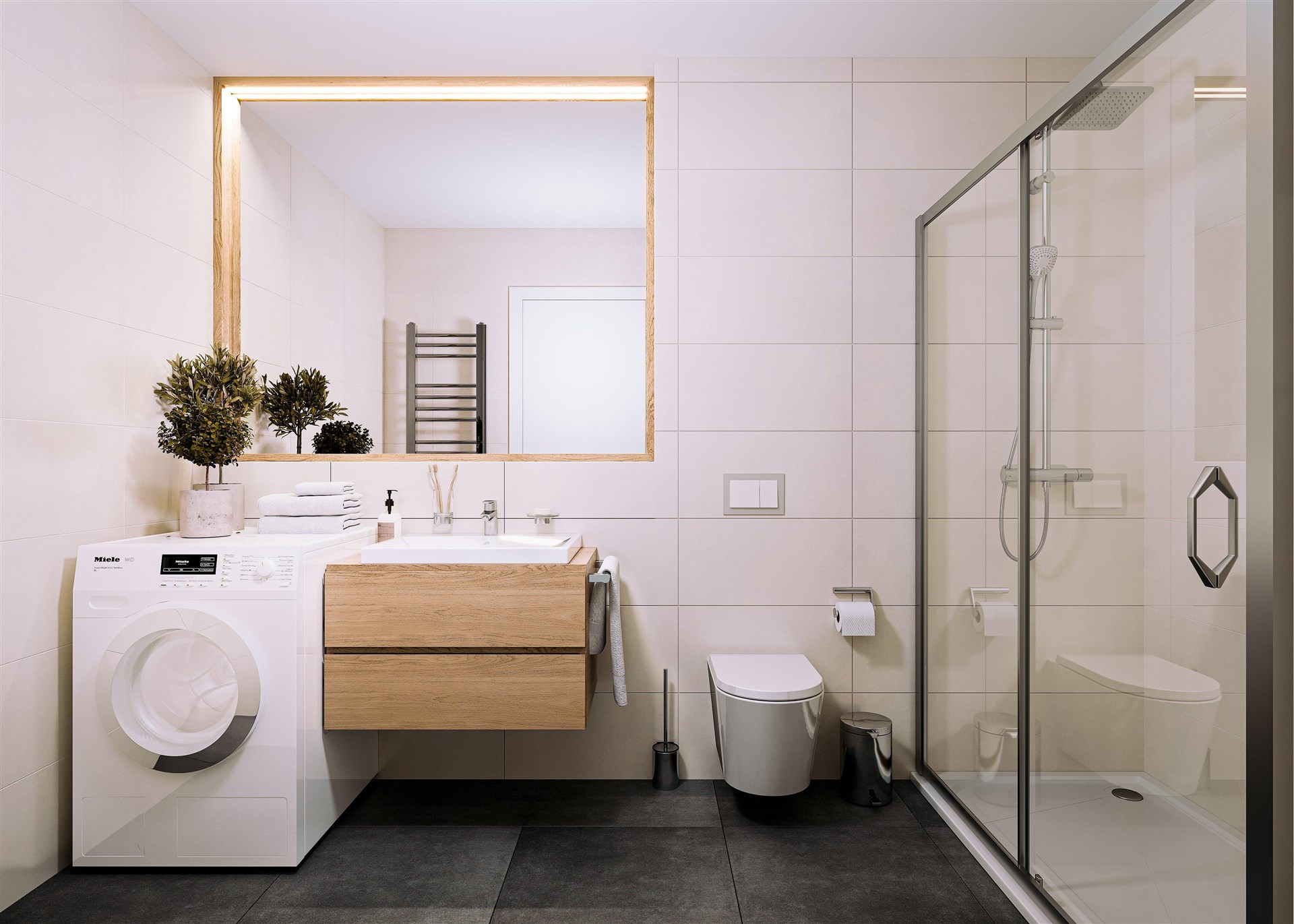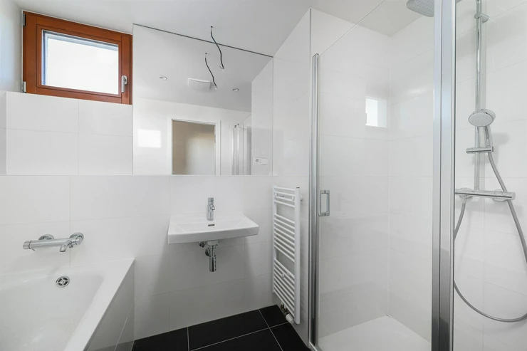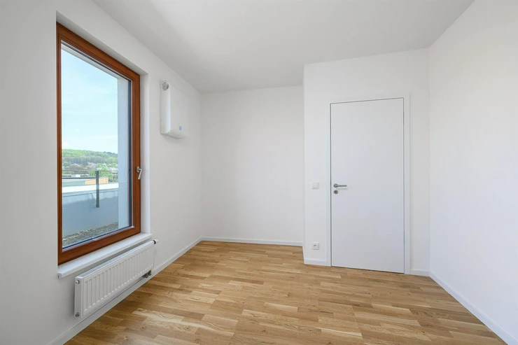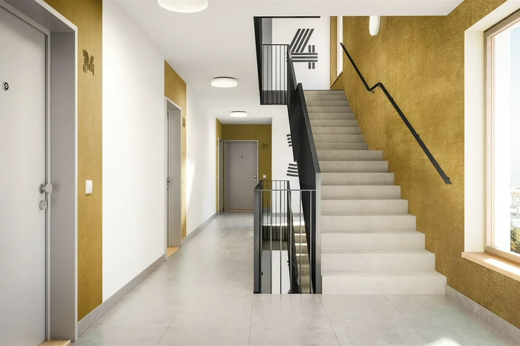 The total area of the apartment is 73.9 m². Another space is provided by the roof designed to be walked on and used as a viewing terrace and a place to relax. Apartments in the Fit Out standard are finished up to the final surfaces, including sanitary ware. The unobtrusive concept highlights a purity of style. The sober appearance is accompanied by phenomenal functionality and effectiveness. The size of the house provides plenty of privacy as well as opportunities to build relationships with your neighbours. The modern apartment building is sensitively incorporated into the block development of the popular Nusle district.