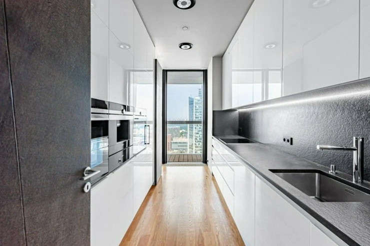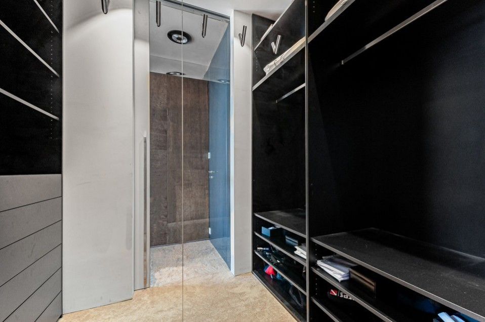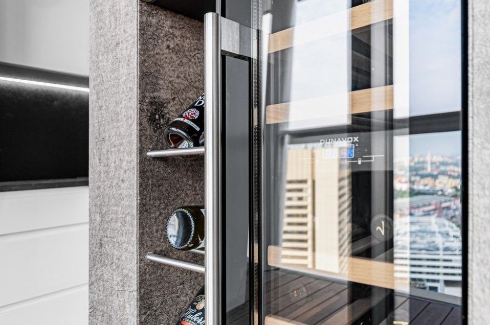 The equipment includes a fully equipped Hanák kitchen unit in a white glossy design with built-in Miele appliances, including a wine shop and a built-in Poggenpohl wardrobe. Luxurious wooden floors in the living room with kitchen, carpets in the bedrooms, Carrara marble in the bathrooms, large-format tiles in blanketsoru copper and Villeroy and Boch fixtures. Lighting throughout the apartment and exterior blinds with remote control, plus air conditioning.