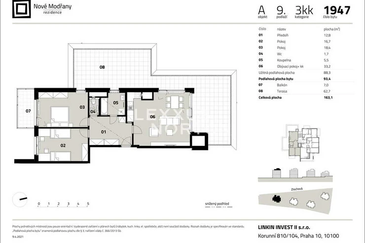 Nove Modrany offers for sale an apartment 3+kk with a generous terrace. The apartment is located on the 9th floor of a modern residence growing in Prague Modrany.The project has been approved, the apartments are immediately available for handover.Nove Modrany is a unique project that combines the comfort of a big city with the freedom of nature. The above-standard apartment 3+kk of 88.3 sqm will enchant you with a spacious terrace, which the developer enlarged to connect the apartment with the surrounding greenery. One generous terrace connects the living room with the kitchenette. There are also two separate, spacious bedrooms. A separate bathroom with a bathtub and a separate toilet completes the apartment. The Nove Modrany project includes an outdoor gym, a café, 3 children's playgrounds with trampolines and a park growing on the east side. The project also includes a pram barn, scooter stands and electric car chargers.Modrany is one of the lively districts of Prague. All you have to do is run down to the Vltava on the evening beach volleyball, get on a bike or just take a walk in the Modranska ravine. You can go shopping and ice cream on foot and you can arrange everything you need in Modrany. The tram from Modrany will take you to the center in a few minutes without a transfer, and the direct connection to the Prague ring road will seamlessly connect you with the D1 and other motorways.