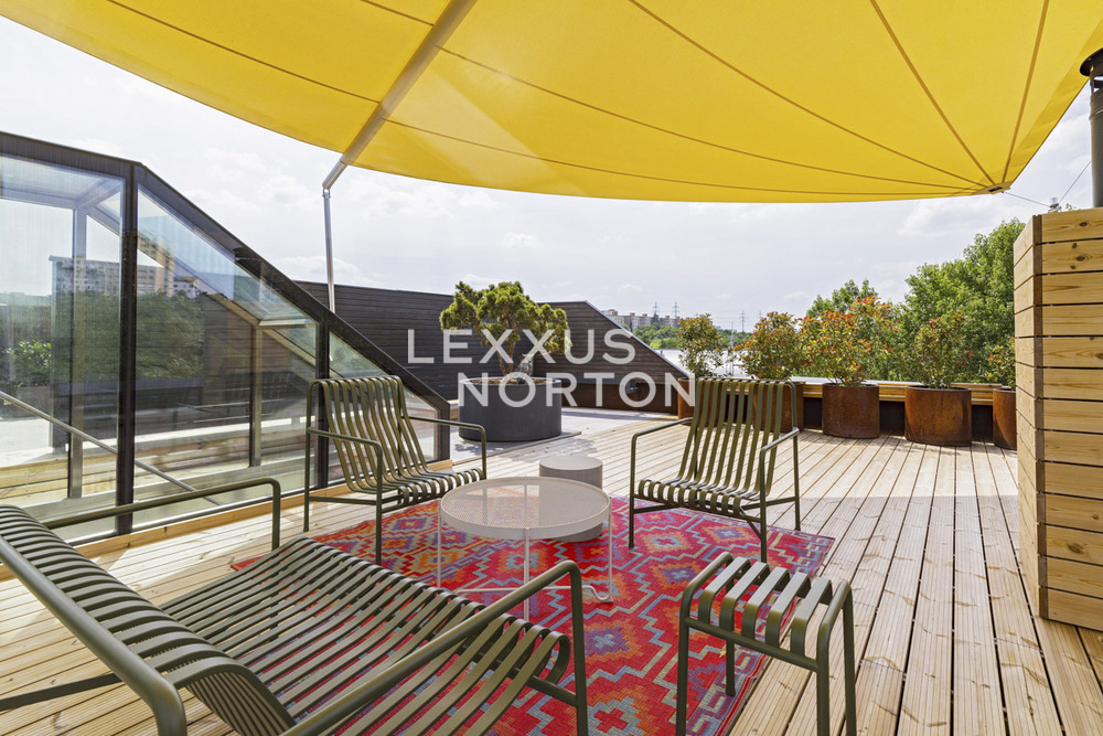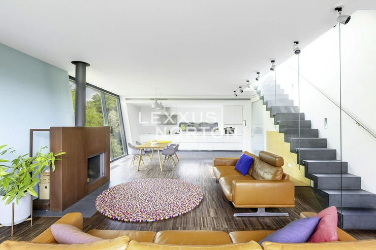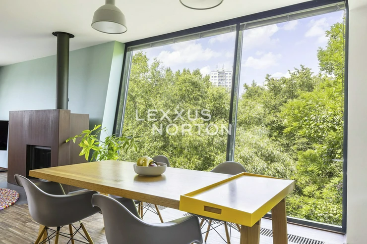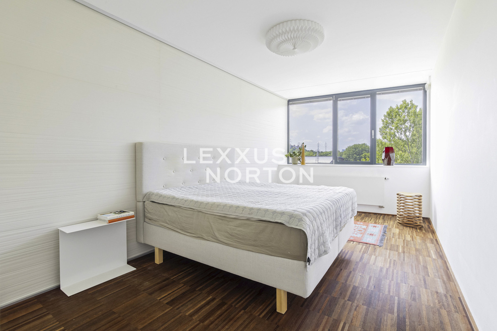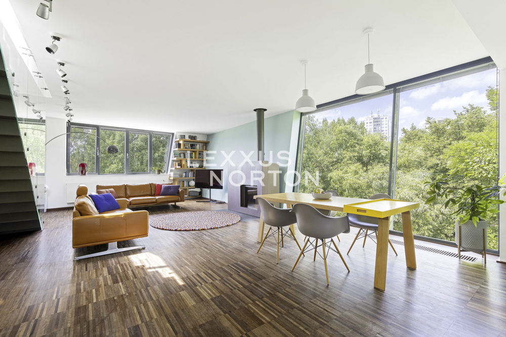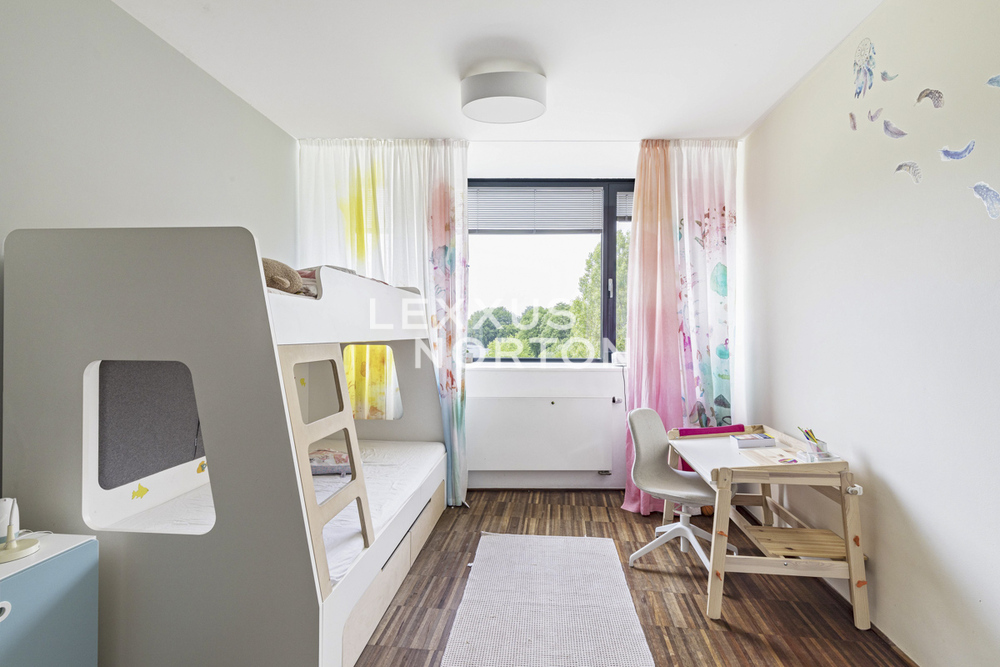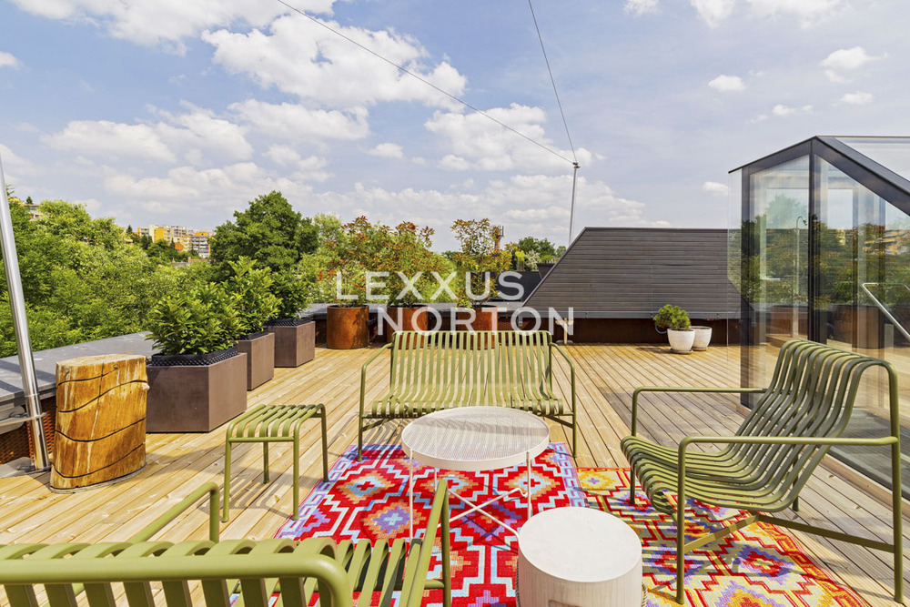 This modern and exceptionally spacious apartment immediately captivates with its airiness and connection to the surrounding greenery. Large windows flood the interior with light and open up unique views of the Botič River and the extensive private grounds. The central living area with a designer Stûv fireplace and a kitchen with built-in appliances feels spacious and naturally connects to the exterior. The real highlight is the elegant staircase leading directly from the living room to the 135 m² roof terrace, which offers privacy, tranquility, and space for relaxation under the open sky. The layout of the apartment is designed to suit both family and comfortable residential living.There are two bedrooms, a small children's room, a bathroom with a bathtub and shower, a separate toilet, a storage room, and a separate laundry room. The high standard is underlined by premium materials – block flooring made of exotic Jatoba wood, bathrooms lined with high-quality ceramics, and plenty of storage space in the form of built-in wardrobes. The apartment includes a modern kitchen equipped with a complete set of built-in appliances. The newly constructed terrace combines large-format tiles with durable wooden decking. Comfort is enhanced by a system of self-retracting shade sails and carefully designed decorative greenery, which completes the elegant atmosphere of the outdoor space. The terrace is also ready for the installation of a hot tub. An above-standard feature of the offer are three garage parking spaces directly below the apartment with a total area of 86 m² with the possibility of charging electric cars, which are conveniently connected to the apartment by an elevator. The residential building is part of a gated complex with an area of 7,000 m². There is a large garden with a playground and its own well for ecological irrigation.The complex is private, secure, and provides residents with plenty of privacy. The location is in a quiet part of Zabehlice at the end of a cul-de-sac, right next to a tennis and golf club and near Hamersky Pond. The northern border of the property is formed by the Botič River with mature greenery, and the Hamr sports complex and bike path are within walking distance. The location stands out for its minimal noise and excellent accessibility – tram and bus stops are within walking distance, the city center is 20 minutes away by car, the airport is 30 minutes away, and there is a direct connection to the South Connecting Road. This housing is designed for those who are looking for peace, greenery, relaxation, and safety, while still wanting to remain within easy reach of the city center.