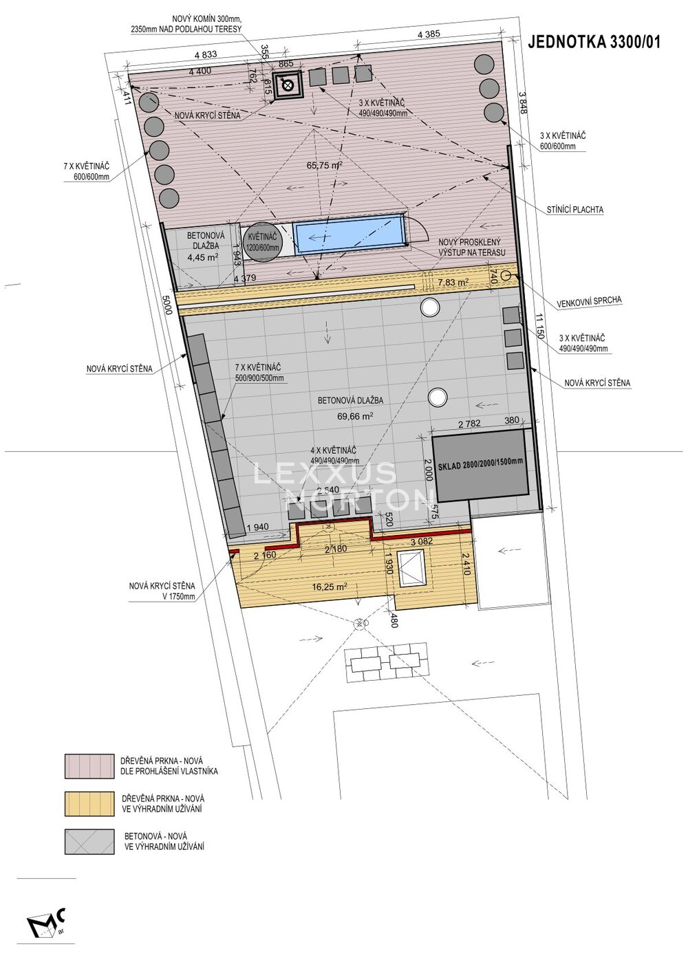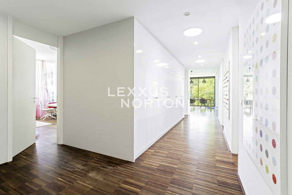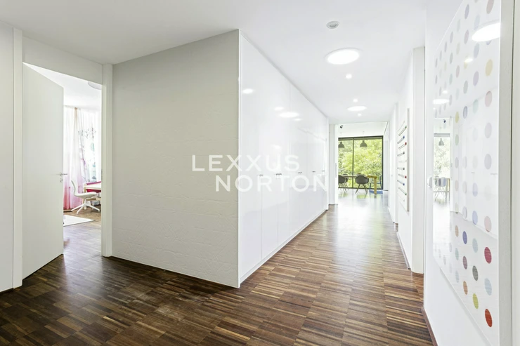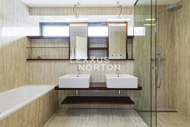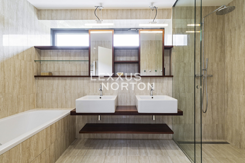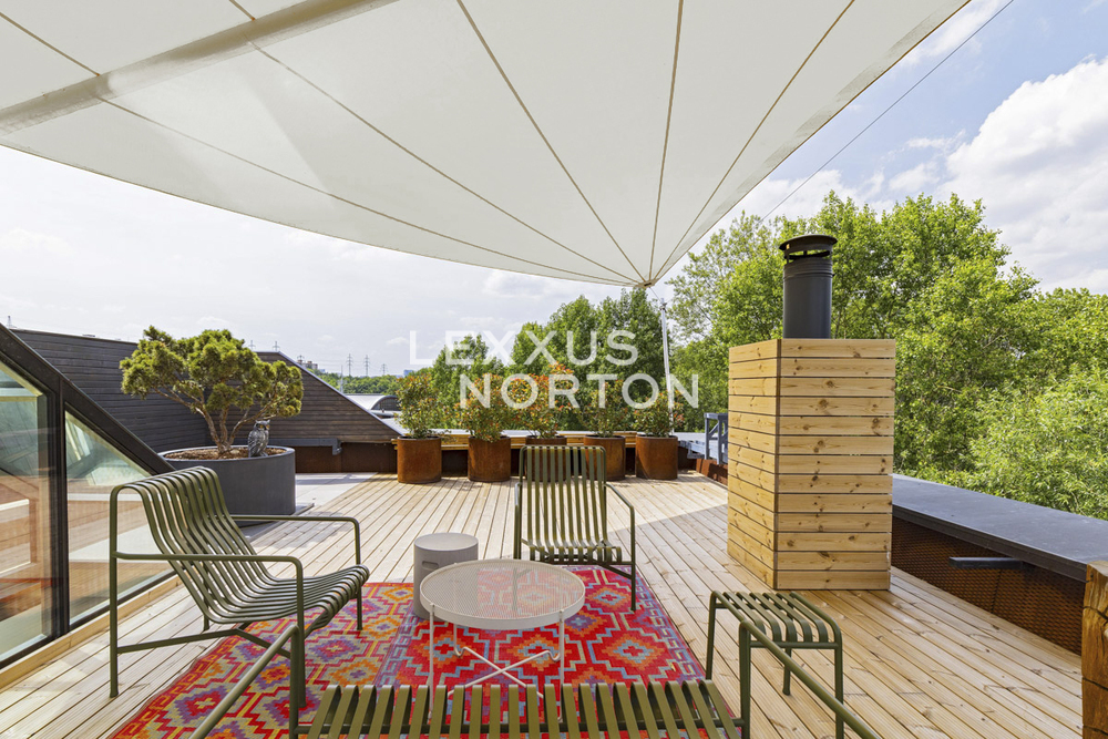This modern and exceptionally spacious apartment immediately captivates with its airiness and connection to the surrounding greenery. Large windows flood the interior with light and open up unique views of the Botič River and the extensive private grounds. The central living area with a designer Stûv fireplace and a kitchen with built-in appliances feels spacious and naturally connects to the exterior. The real highlight is the elegant staircase leading directly from the living room to the 135 m² roof terrace, which offers privacy, tranquility, and space for relaxation under the open sky. The layout of the apartment is designed to suit both family and comfortable residential living.There are two bedrooms, a small children's room, a bathroom with a bathtub and shower, a separate toilet, a storage room, and a separate laundry room. The high standard is underlined by premium materials – block flooring made of exotic Jatoba wood, bathrooms lined with high-quality ceramics, and plenty of storage space in the form of built-in wardrobes. The apartment includes a modern kitchen equipped with a complete set of built-in appliances. The newly constructed terrace combines large-format tiles with durable wooden decking. Comfort is enhanced by a system of self-retracting shade sails and carefully designed decorative greenery, which completes the elegant atmosphere of the outdoor space. The terrace is also ready for the installation of a hot tub. An above-standard feature of the offer are three garage parking spaces directly below the apartment with a total area of 86 m² with the possibility of charging electric cars, which are conveniently connected to the apartment by an elevator. The residential building is part of a gated complex with an area of 7,000 m². There is a large garden with a playground and its own well for ecological irrigation.The complex is private, secure, and provides residents with plenty of privacy. The location is in a quiet part of Zabehlice at the end of a cul-de-sac, right next to a tennis and golf club and near Hamersky Pond. The northern border of the property is formed by the Botič River with mature greenery, and the Hamr sports complex and bike path are within walking distance. The location stands out for its minimal noise and excellent accessibility – tram and bus stops are within walking distance, the city center is 20 minutes away by car, the airport is 30 minutes away, and there is a direct connection to the South Connecting Road. This housing is designed for those who are looking for peace, greenery, relaxation, and safety, while still wanting to remain within easy reach of the city center.