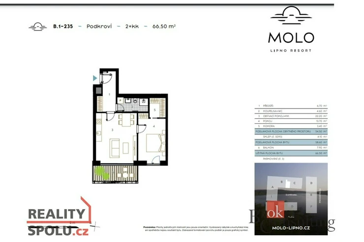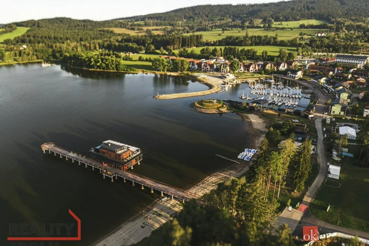 Exluzivně nabízíme k prodeji plně zařízený byt o velikosti 2+kk v nedávno dokončeném luxusním resortu Molo Lipno. Nádherný apartmán s podlahovou plochou 54,5 m2 a balkonem 7,9 M2 je kompletně zařízený v nejvyšším standardu s důrazem na moderní a funkční design a můžete ho tak ihned začít využívat. K bytu náleží vlastní prostorné parkovací stání a velká sklepní kóje v suterénu, odkud pohodlně vyjedete výtahem až ke dveřím. Molo Lipno resort patří mezi nejúspěšnější projekty v České republice a sklidil celou řadu architektonických ocenění. Dominantou projektu je vyhlídkové molo s fine diningovou resaurací Molo Restaurant a barem. Snídani či špičkovou kávu si můžete dopřát i v kavárně Café du Lac na nově zbudované promenádě. Přehrada Lipno je unikátní svým horským klimatem a možností provozovat sportovní a relaxační aktivity po celý rok - od jara do podzimu si můžete užívat četné cyklotrasy, jachting, stezku v korunách stromů, houbaření nebo turistické výlety po bližším i vzdálenějším okolí. V zimě je Vám k dispozici dobře vybavený skiareál přímo v Lipně nad Vltavou nebo v nedalekém Hochfichtu a pokud pokud hladina Lipna zamrzne, přijde na řadu legendární bruslení. V resortu je Vám k dispozici i kompletní concierge služba, která ráda pomůže při organizaci aktivit či případném pronájmu bytové jednotky. Doporčujeme si byt prohlédnout prostřednictvím virtuální prohlídky a následně se objednat u makléře k prohlídce osobní. Jde o zcela výjimečnou nemovitost uvolněnou nyní developerem v jinak už zcela vyprodaném projektu!