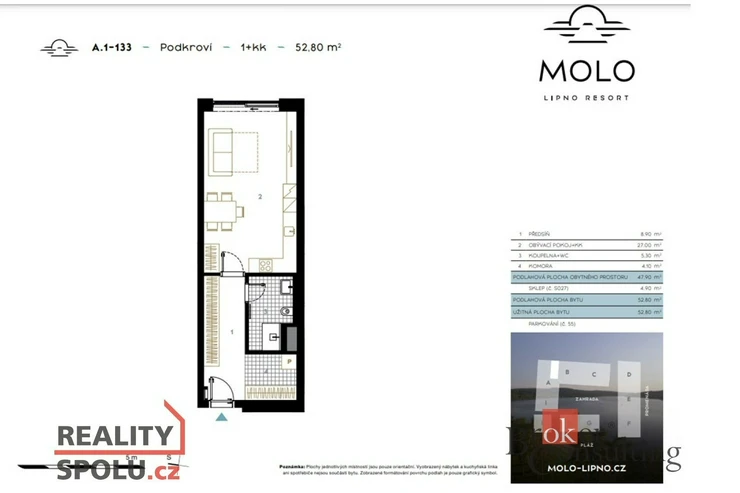 Exluzivně nabízíme k prodeji plně zařízený byt o velikosti 1+kk v nedávno dokončeném luxusním resortu Molo Lipno. Nádherný apartmán s podlahovou plochou 47,9m2 je kompletně zařízený v nejvyšším standardu s důrazem na moderní a funkční design a můžete ho tak ihned začít využívat. K bytu náleží vlastní prostorné parkovací stání a velká sklepní kóje v suterénu, odkud pohodlně vyjedete výtahem až ke dveřím. Molo Lipno resort patří mezi nejúspěšnější projekty v České republice a sklidil celou řadu architektonických ocenění. Dominantou projektu je vyhlídkové molo s fine diningovou resaurací Molo Restaurant a barem. Snídani či špičkovou kávu si můžete dopřát i v kavárně Café du Lac na nově zbudované promenádě. Přehrada Lipno je unikátní svým horským klimatem a možností provozovat sportovní a relaxační aktivity po celý rok - od jara do podzimu si můžete užívat četné cyklotrasy, jachting, stezku v korunách stromů, houbaření nebo turistické výlety po bližším i vzdálenějším okolí. V zimě je Vám k dispozici dobře vybavený skiareál přímo v Lipně nad Vltavou nebo v nedalekém Hochfichtu a pokud pokud hladina Lipna zamrzne, přijde na řadu legendární bruslení. V resortu je Vám k dispozici i kompletní concierge služba, která ráda pomůže při organizaci aktivit či případném pronájmu bytové jednotky. Doporčujeme si byt prohlédnout prostřednictvím virtuální prohlídky a následně se objednat u makléře k prohlídce osobní. Jde o zcela výjimečnou nemovitost uvolněnou nyní developerem v jinak už zcela vyprodaném projektu!