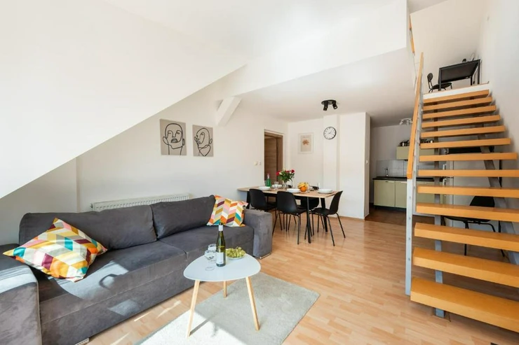 We offer for sale a spacious and bright duplex apartment 4+kk of 120,57 sqm, situated on the 5th floor of a well-maintained apartment building with elevator in a desirable location of Smichov, on Grafická street. This unique apartment stands out for its thoughtful layout and excellent accessibility to the city centre.