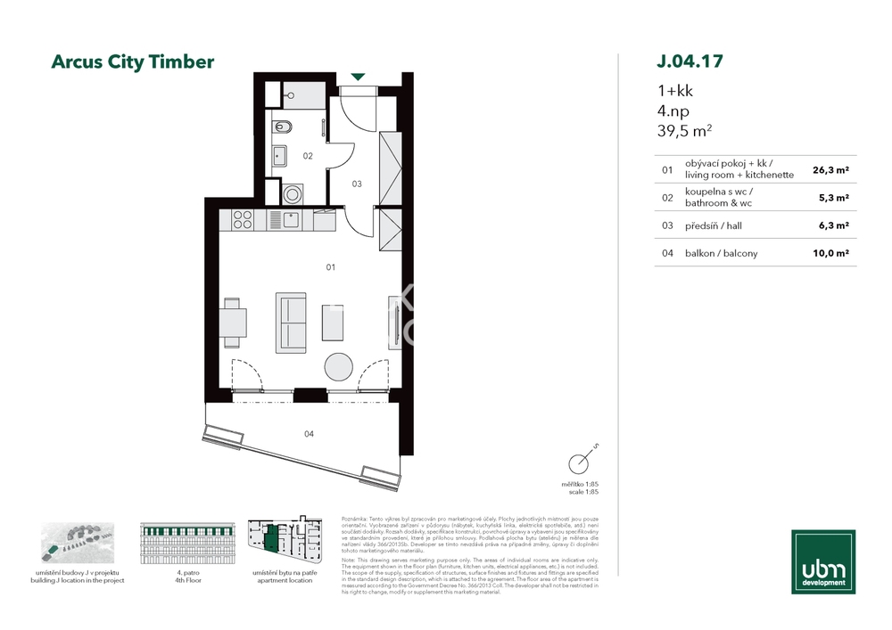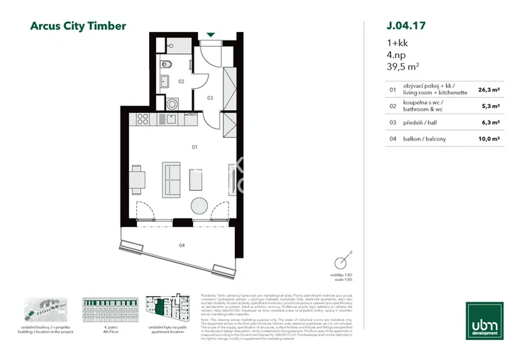 We are proud to offer a modern, already finished apartment 1+kk of 39,5 sqm with a balcony of 10,0 sqm, located on the 4th floor. The apartment is dominated by the main living room connected to the balcony and kitchenette.There is also an assigned parking space and cellar, which are not included in the price of the apartment.Thanks to its construction in Energy Efficiency Category A, the building meets the strict ecological standards of the BREEAM Excellent certification, which guarantees sustainable living at the highest level.Timber Prague, a sustainable wooden apartment building and the very first project of its kind in Prague. High quality living with good energy, timeless design and creative spirit. Apartment 1+kk for sale, which meets all these benefits complemented by complete civic amenities and perfect accessibility to Prague.Timber Prague is the future of living with good energy. The building has a wide range of energy-efficient technologies, such as photovoltaic panels, heat pumps, and geothermal wells, ensuring both environmental friendliness and energy self-sufficiency. For extra comfort and efficiency, it includes exterior blinds, underfloor heating with dual functionality for cooling during summer and heating in winter, and a Smart Home system that monitors energy consumption and regulates heating and cooling. The blend of sustainability and cutting-edge technology positions wood-frame buildings as a modern, eco-conscious choice for living.The project is realized within the residential complex Arcus City, located in the Prague-Repory. The project includes a new bus stop connecting the residential complex with the metro stations B Stodulky and Luka, which will provide residents with a quick connection to the centre of Prague. Nearby you will find all civic amenities. Nurseries, schools, shops, sports facilities, restaurants and medical facilities. You can relax in the nearby Repora Biopark, Prokopske and Dalejske valley.
