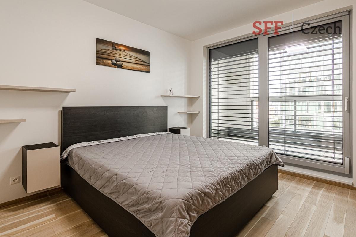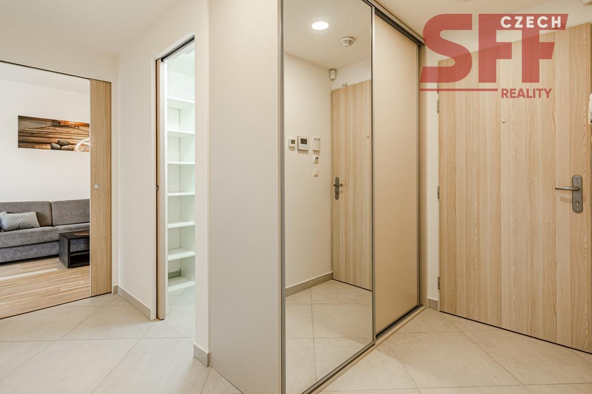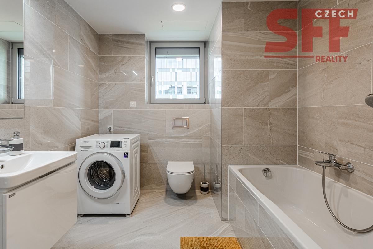 Furnished apartment 2+kk consists of an entrance hall with built-in wardrobe, spacious closet (wardrobe) with shelves, living room with access to a spacious terrace, kitchenette equipped with all appliances such as dishwasher, refrigerator and freezer (Liebherr), el. oven, electric ceramic hob, microwave, hood, 1 separate bedroom with double bed and second entrance to the terrace, bathroom with tub and toilet.