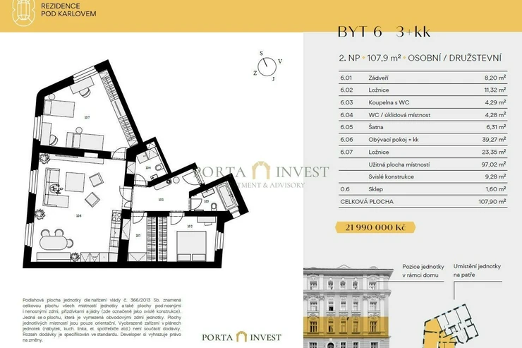 Imagine waking up every morning in a spacious apartment where the first morning rays illuminate the majestic silhouette of Vyšehrad. That is the life offered to you by this exceptional 3+kk apartment with a generous area of 106.3 m² in the prestigious Residence Pod Karlovem.