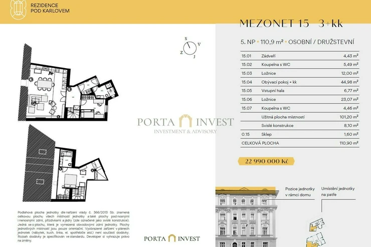 Do you desire an exceptional home that surpasses the boundaries of ordinary living? Discover the breathtaking 3+kk duplex apartment of a generous 109.3 m² area in the prestigious Residence Pod Karlovem.