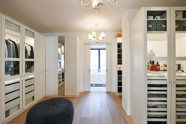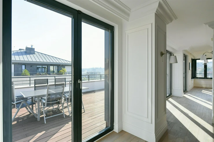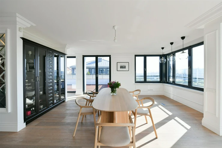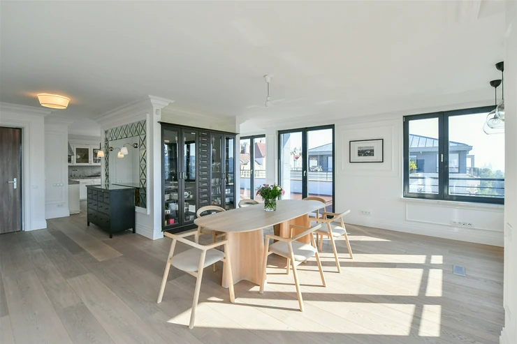 The carefully designed penthouse features a spacious central dining room smoothly connected to a kitchen equipped with high-quality fittings, behind which is a separate utility room/laundry. On the other side of the dining room, we enter the living room facing south, which is partially separated by a see-through wall. There is a smaller wardrobe and a separate toilet for guests near the entrance. This entire area forms the central and communal zone of the penthouse. From the living room, double doors lead to the quiet area of the apartment, which includes a large hall, a technical room, a separate toilet, three separate rooms, and the master bedroom, which is followed by a generous walk-through wardrobe with plenty of storage space, and further a large bathroom with a centrally located bathtub, shower, and entrance to the balcony.
