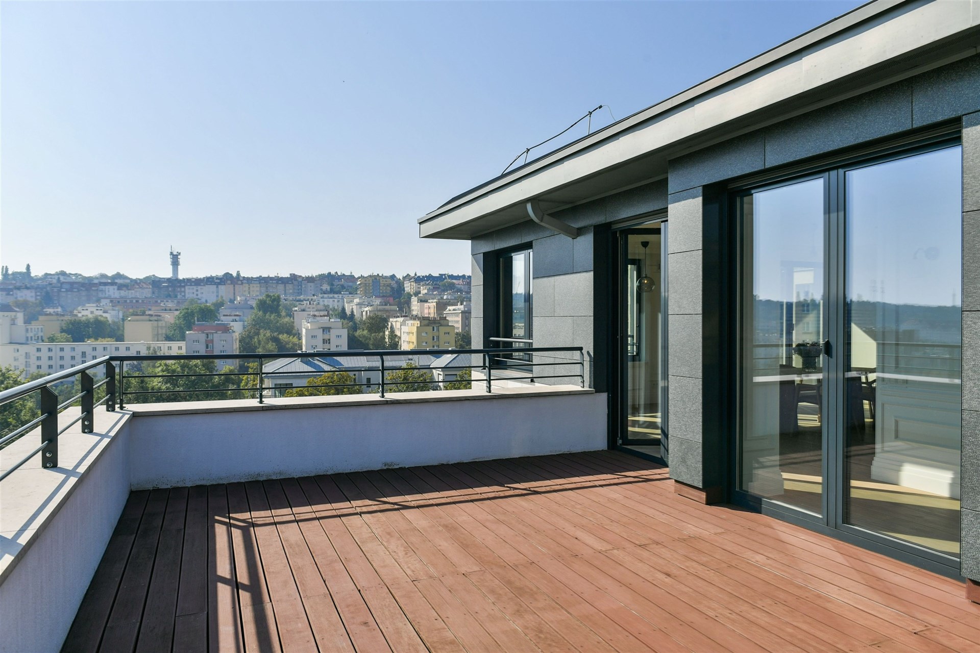 This exceptional, large-scale apartment spans a single floor, covering an area of 282 m2, complete with balconies and terraces totaling 99 m2. It is located on the top floor of the unique Kajetánka project. From the penthouse, thanks to the panoramic view, you primarily see Prague Castle, Strahov Monastery, Petřín, Strahov, or the Břevnov precincts.