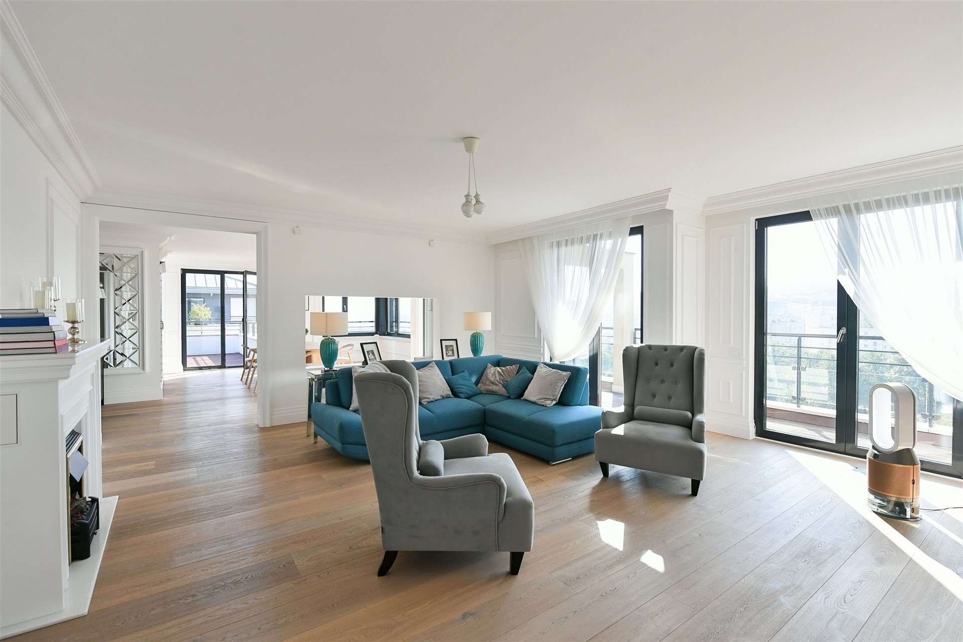 All rooms (except for one office) have access to the terrace or balconies through French windows.