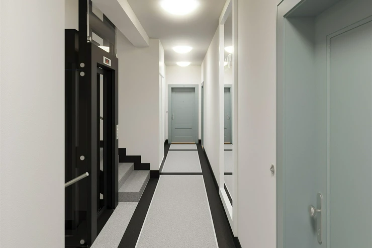 - Marble tiles in the common areas, designer lighting made of cut glass, new glass elevator, mailboxes and security doors made of oak wood