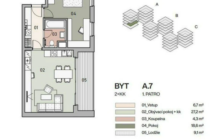 We offer you a new 2+KK apartment with an area of 58.7 m2 with a loggia of 9.1 m2 in a cozy project of three apartment buildings in Rezidenc Klíčov, in the heart of Vysočany and yet surrounded by greenery, not far from the Vysočanská metro station.