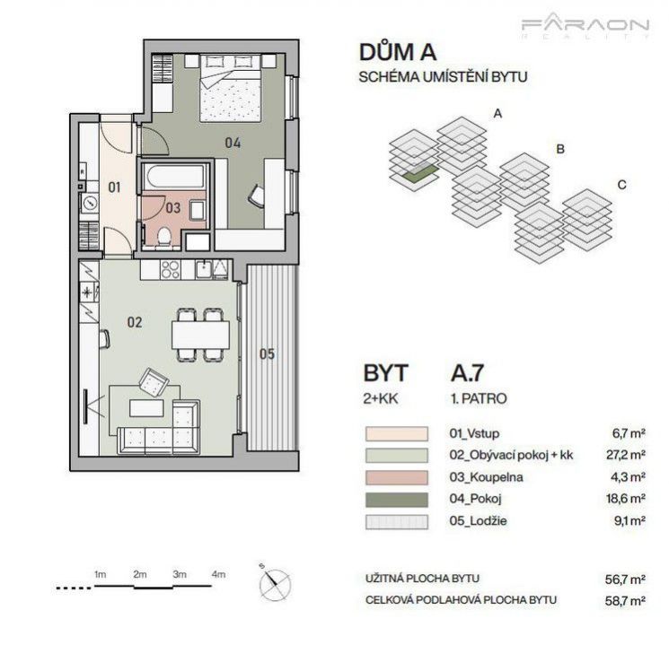 Nearby is the Fénix shopping center and the Harfa Gallery, a school, kindergarten, post office, polyclinic, O2 Arena and all the necessary services, as well as plenty of greenery, the Klíčov Gardens, the Klíčovský háj or the Podvinní park.