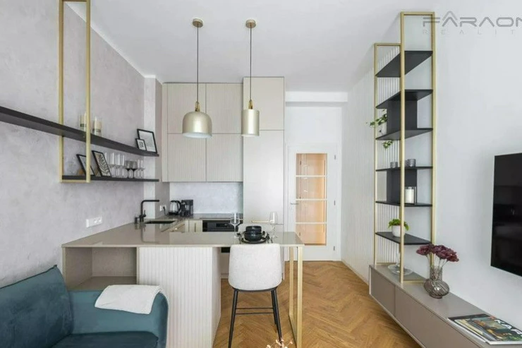 Sale of a representative brand new apartment after complete renovation 1+1 (65.3m2) with a cellar cubicle, with preserved original elements in a unique and at the same time quiet location of Vinohrady in the immediate vicinity of Riegrový Sady on the 2nd floor of a sensitively, luxuriously and completely renovated Art Nouveau apartment building with with a new lift, reception, sauna and a beautifully landscaped courtyard for residents to sit in an extremely attractive location in Vinohrady, just a few minutes' walk to Wenceslas Square with a quick access to all three routes of the Prague metro. The entire house with a reception area in the courtyard is decorated with noble natural materials such as wood, marble, brushed bronze or glass.