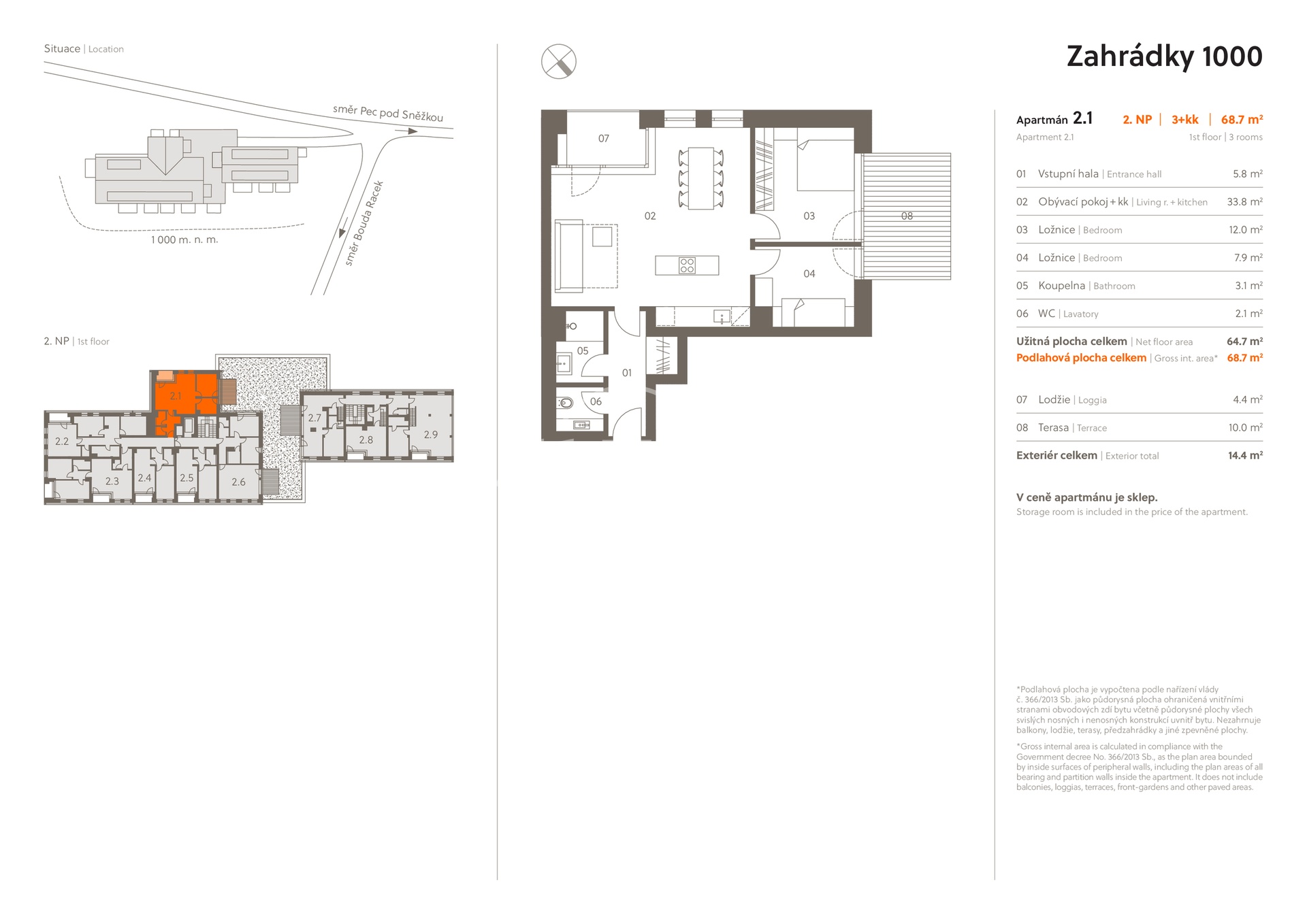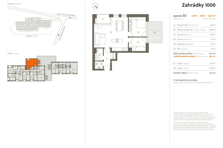 The offered apartment has a layout of 3+kt and a total area of 64.7 sqm with a loggia of 4.4 sqm and a terrace of 10 sqm. It offers two bedrooms with access to the eastern terrace and a living room with access to the southern loggia, as well as a bathroom and a separate toilet. The orientation of the windows is to the SE and NE with a view down the slope towards Pec. The apartment has a cellar.