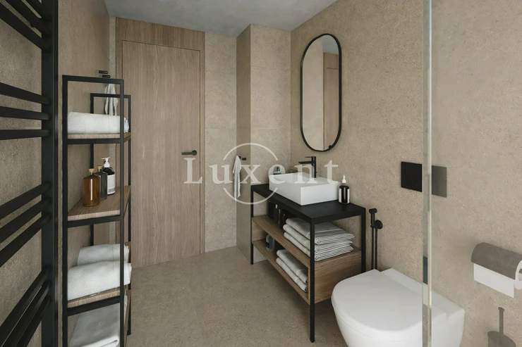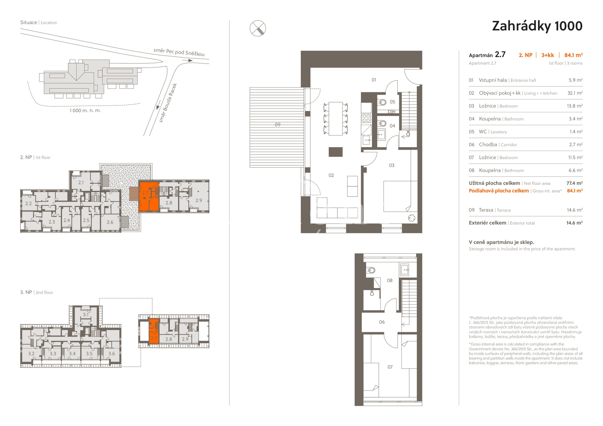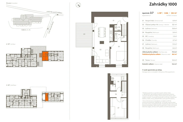 The offered apartment has a layout of 3+kt and a total area of 77.4 sqm with a terrace of 14.6 sqm. It offers two bedrooms, living room with access to the terrace (S), two bathrooms with shower and toilet, separate toilet and hallway. The orientation of the windows is to the S and N. The apartment has a cellar.