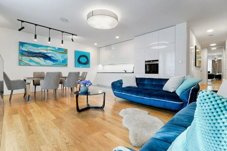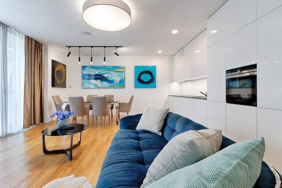 The layout of the 3 bedroom apartment includes an entrance hall, open living room with kitchen in white design and dining room and direct access to the terrace, two separate bedrooms also with access to the terrace, two bathrooms, first spacious bathroom (bath, shower, toilet, bidet), second bathroom with shower and toilet, another separate toilet, a sufficient amount of storage space, cleaning room for a custom-made dressing room. The whole apartment is lined by a walk-in terrace, which is accessible from all rooms.