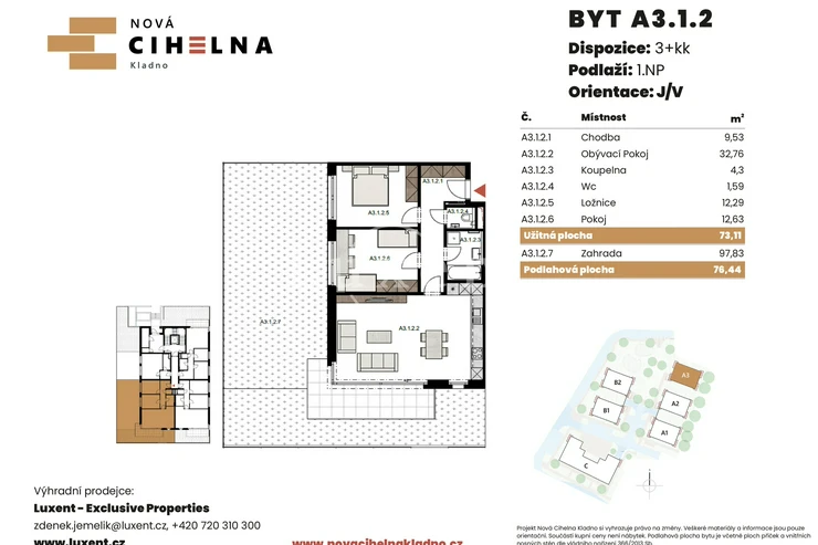 We offer for sale apartment 3+kt with a floor area of 76.44 sqm with a garden of 97.86 sqm in an extremely economical development project Nová Cihelna Kladno arising in the urban area of Kladno - Rozdělov.