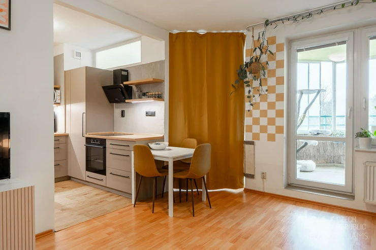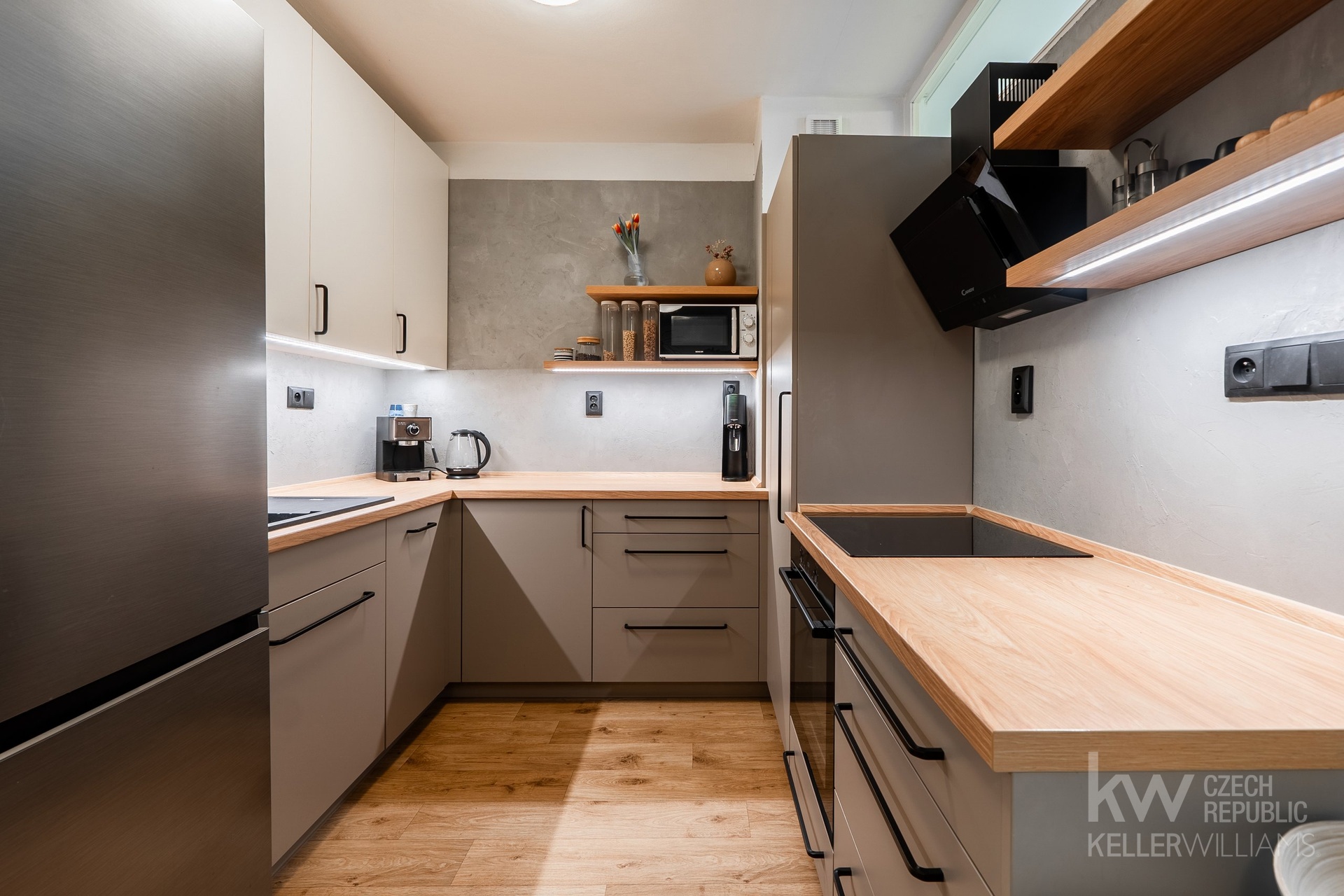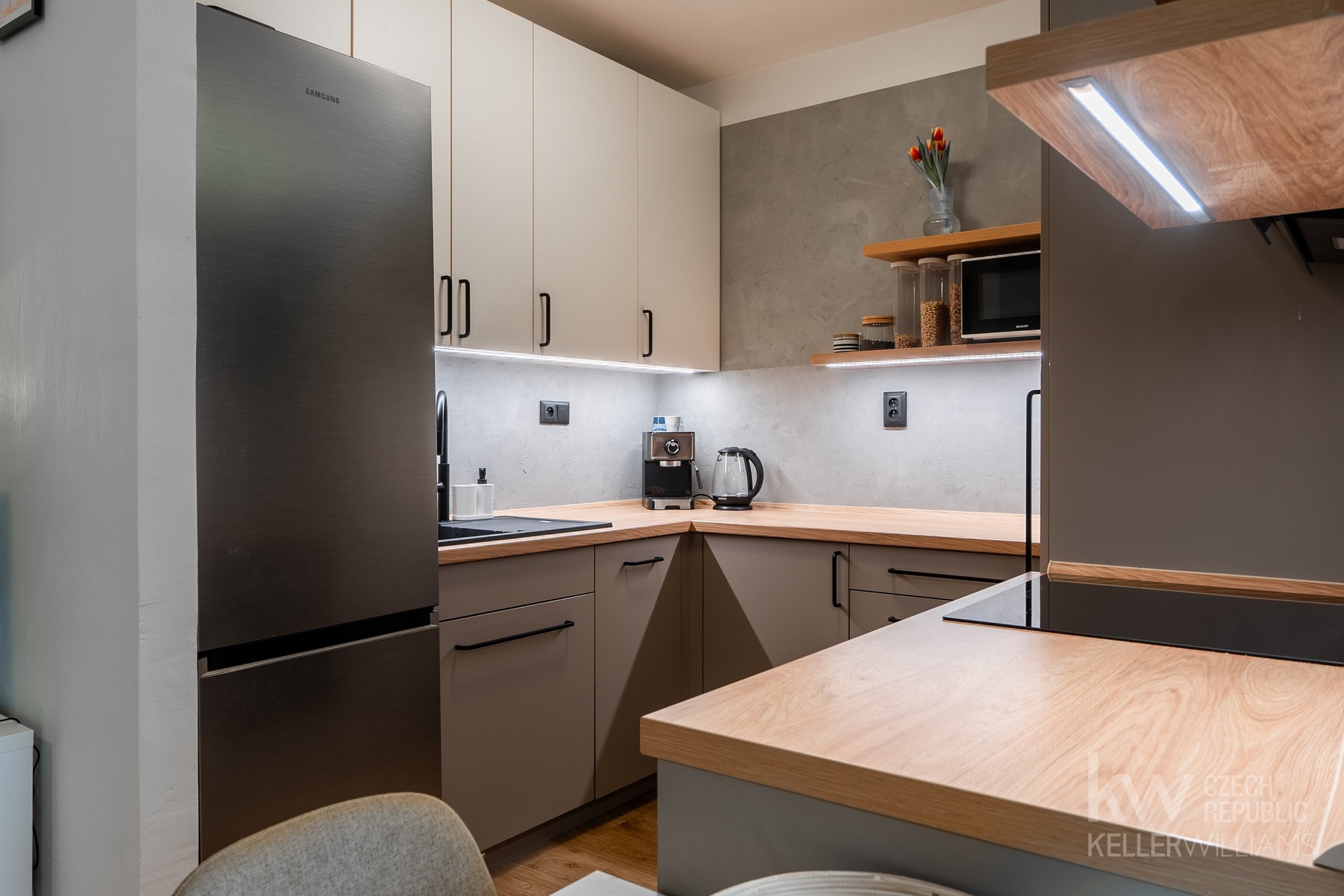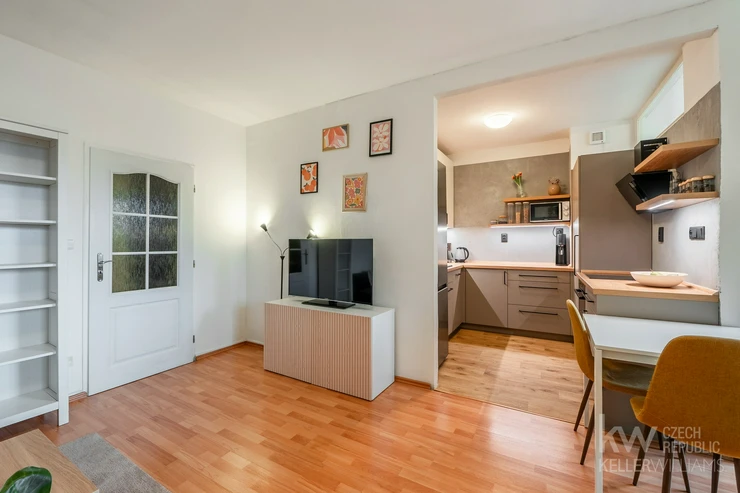 Byt disponuje obývacím pokojem s kuchyňským koutem, ložnicí, chodbu a prostornou koupelnu s toaletou. Kuchyňský kout z roku 2024 je vytvořen na míru a kompletně vybaven spotřebiči (trouba, varná deska, digestoř, myčka a lednice).
