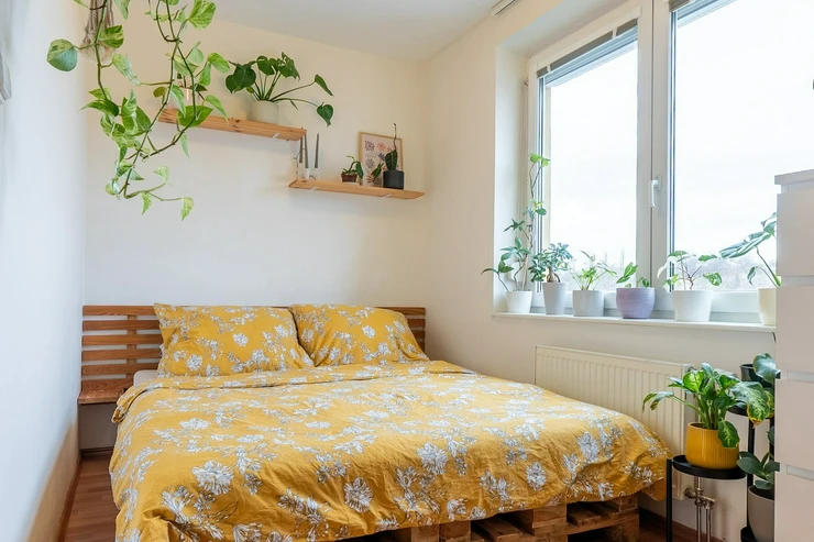 Ložnice je v současné době od obývacího pokoje oddělena pouze závěsem, budoucí majitel si ji však může jednoduše předělit příčkou a vytvořit tak plnohodnotnou samostatnou místnost.