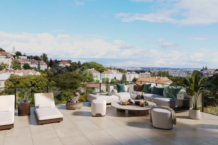 Premium penthouse B.8.1 called VISTA with 4+kk (119.8 m2) with two terraces (63.3 m2 and 42.0 m2) is located on the 8th floor of Rezidence Radimova in the heart of Břevnov, Prague 6.
