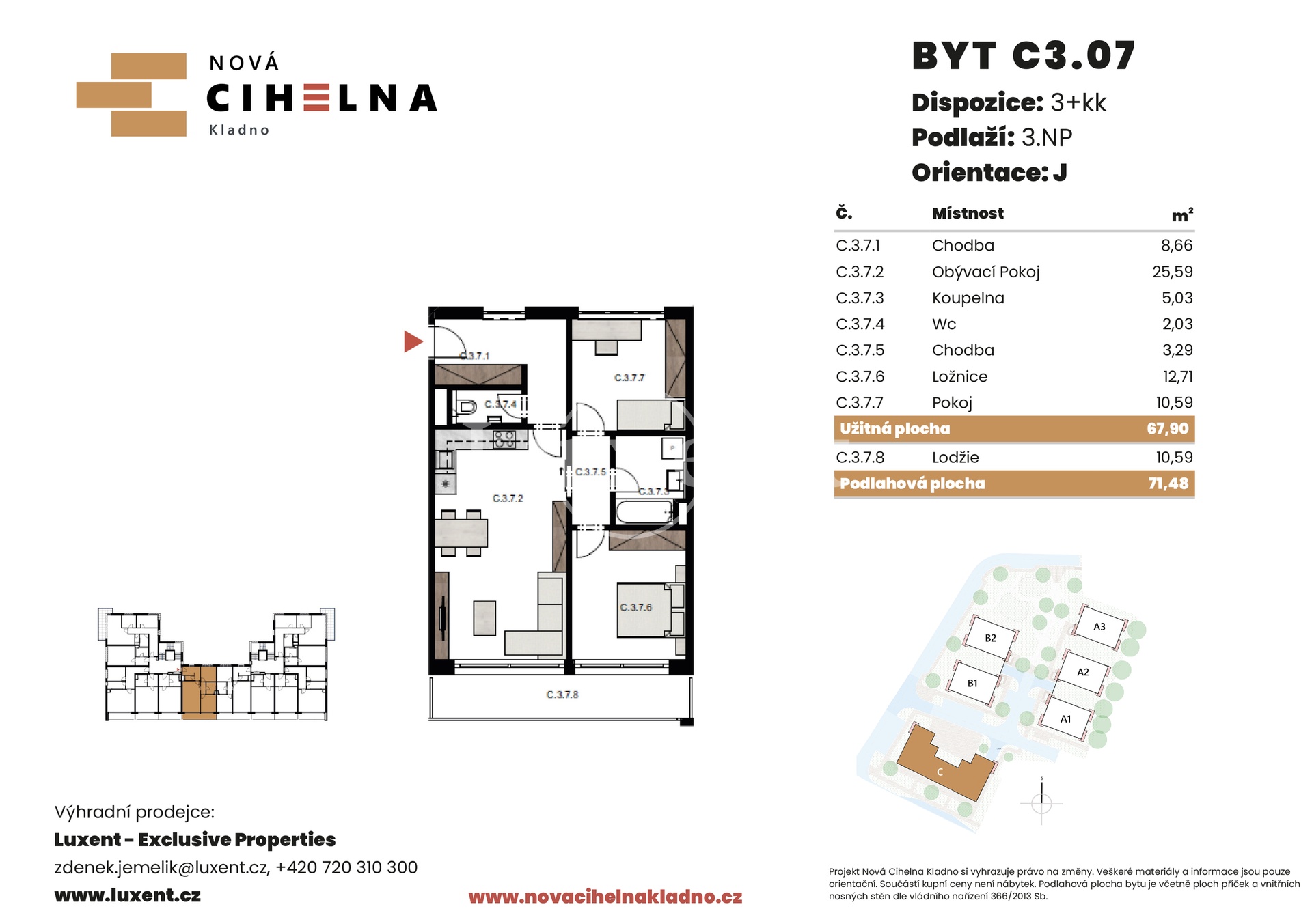 We offer for sale apartment 3+kt with a floor area of 71.48 sqm with a loggia of 10.59 sqm in an extremely economical development project Nová Cihelna Kladno arising in the urban area of Kladno - Rozdělov.