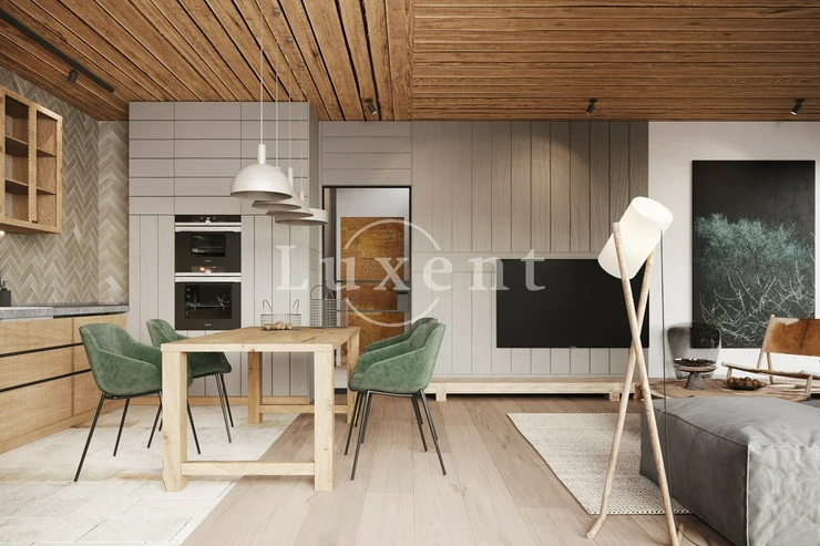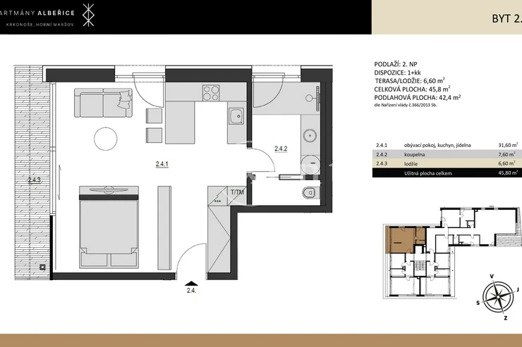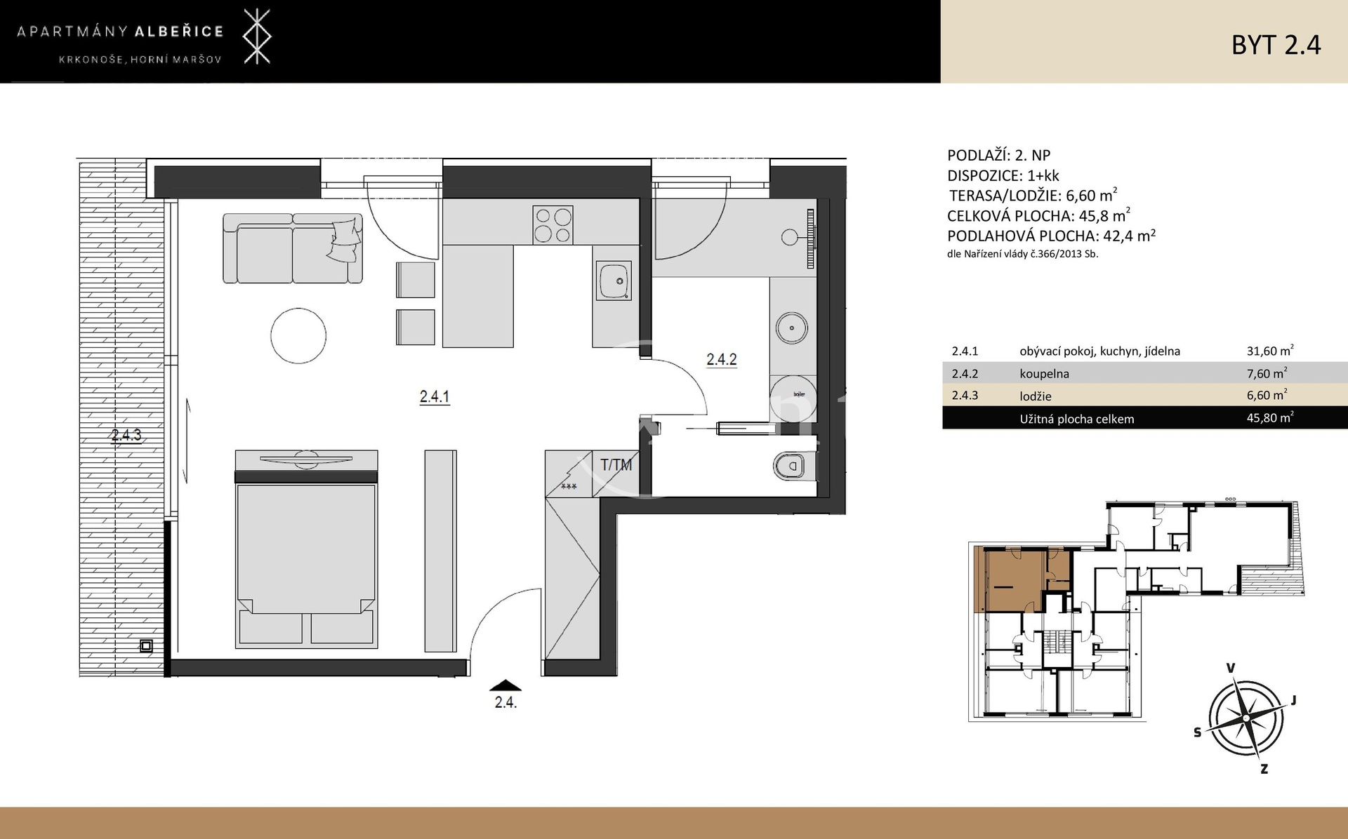 In the newly built project Apartments Albeřice we offer for sale an apartment with a layout of 1+kt and an area of 39.2 sqm with a loggia of 6.6 sqm - a total of 45.8 sqm. The apartment is located on the 1st floor of the project and is oriented NE. It is furnished to a high standard, which can be expanded to a higher standard, especially in terms of the extent of lining the walls and ceilings of individual rooms with rustic aged wood. If interested, we can arrange for the apartments to be furnished with kitchens and furniture from a renowned design studio in various price ranges. The apartment includes storage space in a secure separate storage room. The apartment comes with a covered parking space for CZK 450,000 - not included in the price of the apartment. There is also an outdoor sauna and a shared ski storage room on the 1st floor with lockable boxes.